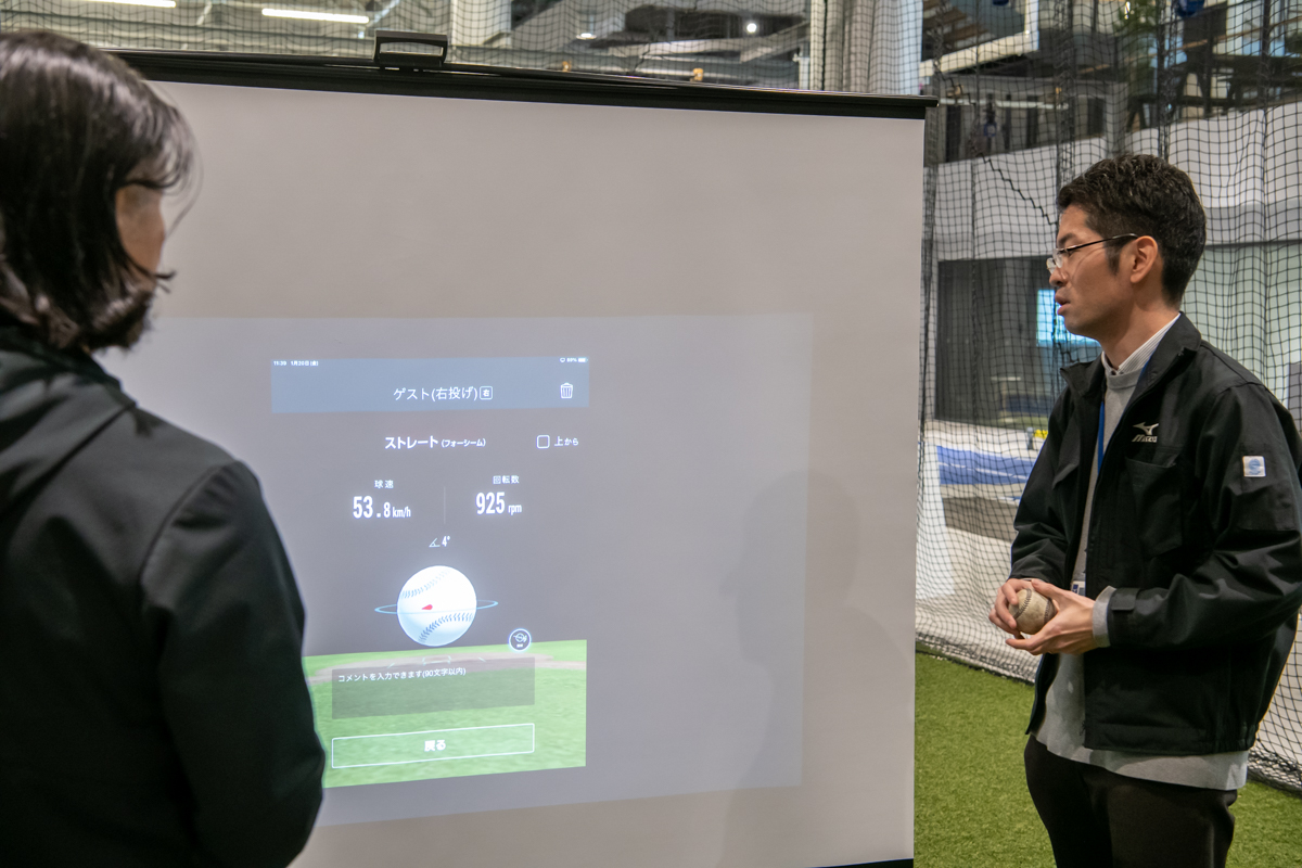 「投げていただいた結果は……。残念ながら大田原さん、球速、回転数ともに、小中学生以下でした(苦笑)。ボールの回転も、イメージはピストルの弾やドリルのような回転に近く、ボールが平均より沈むような球筋です。一方、プロ投手の球は、縦方向に回転するので、揚力が生まれ、ボールが伸びます。今までは球速ばかりを話題にしてきましたが、MA-Qを使って回転に着目すると、さらにいろいろなことが分かってきます。この施設では、MA-Qアプリの操作性を高めるテストも行っています」(柴田さん)
