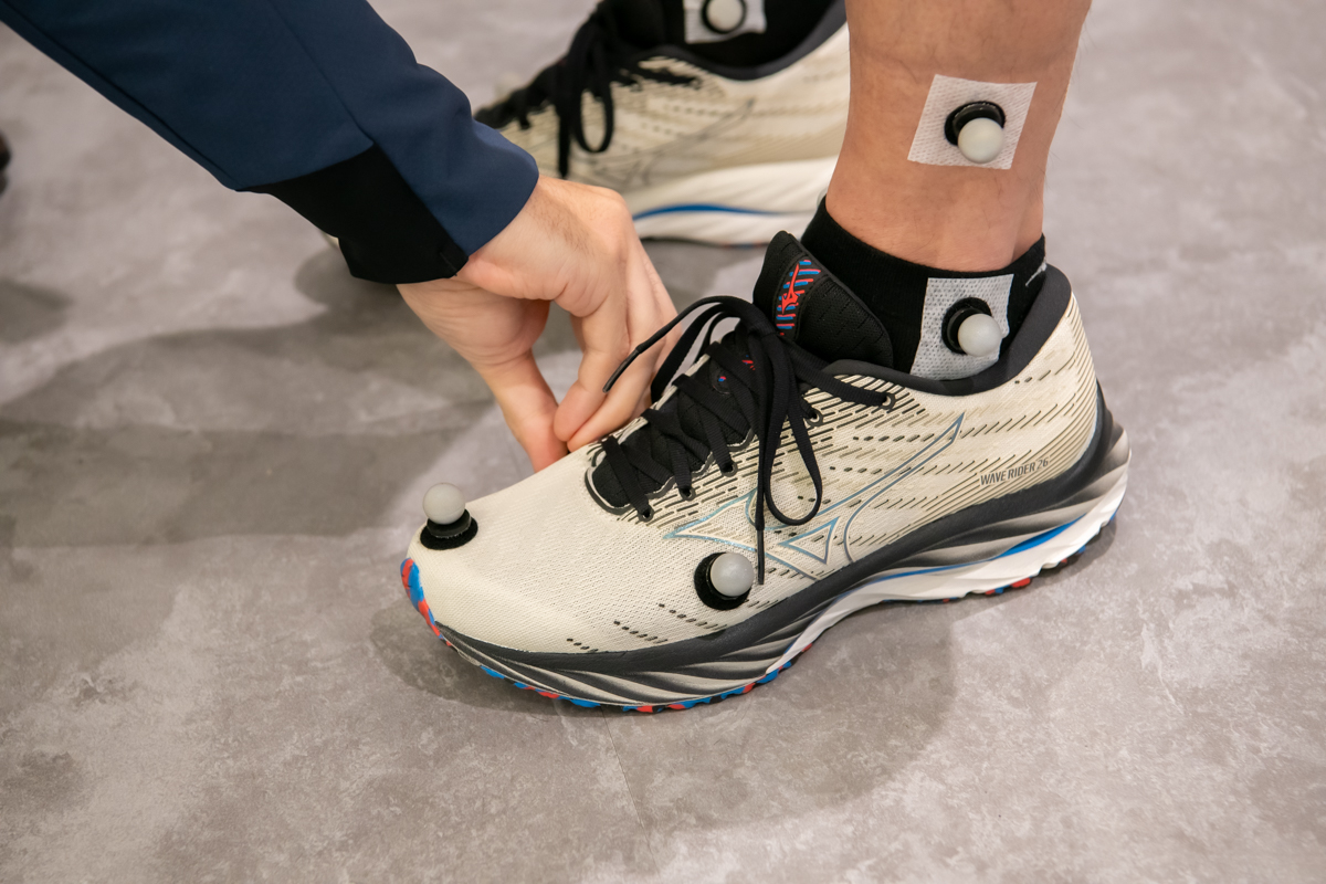 「日本に1台しかない、このマシンが優れている点は、傾斜を可変させられる上に、逆回転ができることです。つまり、平地にいながら、坂道を上るだけでなく、下るテストまで可能です。スピードは、時速25㎞まで出ます。今日はせっかくなので、箱根の平均的な6%斜度と、箱根の最大斜度13%を再現してみますので、ぜひ、最新のランニングシューズ『ウエーブライダー26』を履いて、ウエーブライダー史上最高のクッション性を体感してみてください」(古川さん)