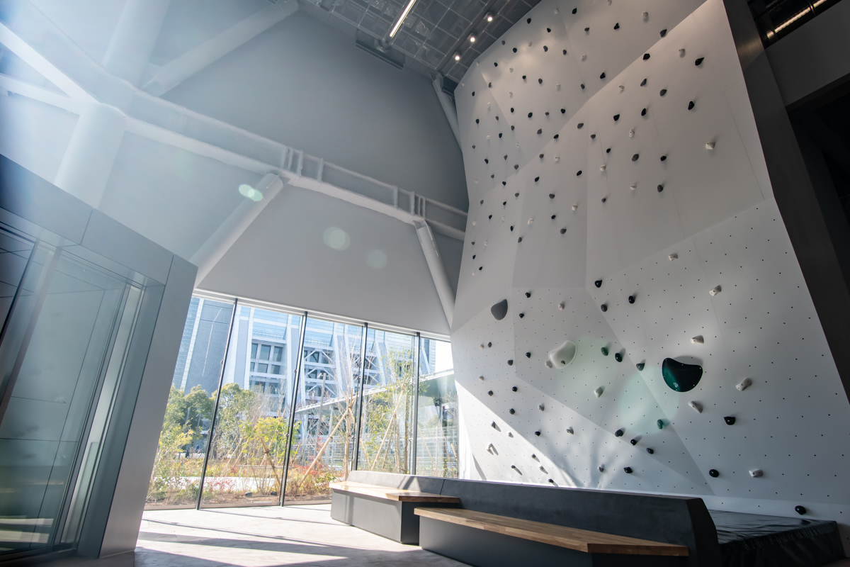 MIZUNO ENGINEのエントランスを入って、まず目に飛び込むのは、クライミングウォールと、その奥のランニングのテストコース。驚くべきは、発売前のシューズのプロトタイプの製品テストをするテストコースが、来客者の目の前にあるという点だ。シャッターさえ無しの、丸見え! モノづくりの会社にとって最高レベルのセキュリティを要求される場所が、スケスケ……。丸見えのスッケスケには、正直、腰を抜かさざるを得ない。