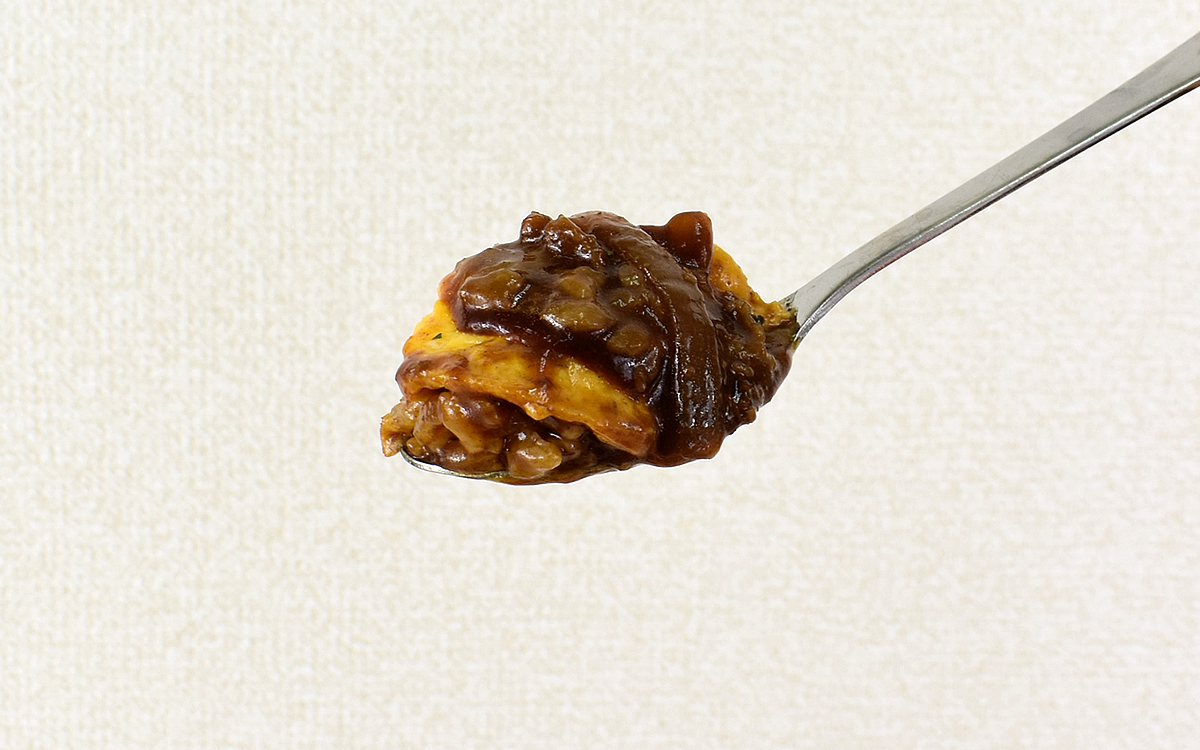 レンジで加熱調理(目安時間 500Wで4分30秒)をおこない、まずは美しい輝きを放つデミグラスソースから一口。こうばしい香りの時点で予想はしていたものの、口に入れた瞬間から濃厚なコクが一気に拡散していきます。“濃厚”といってもただ味が濃いだけでなく、ソースが持つ奥深い旨みをしっかり感じられるのがポイント。