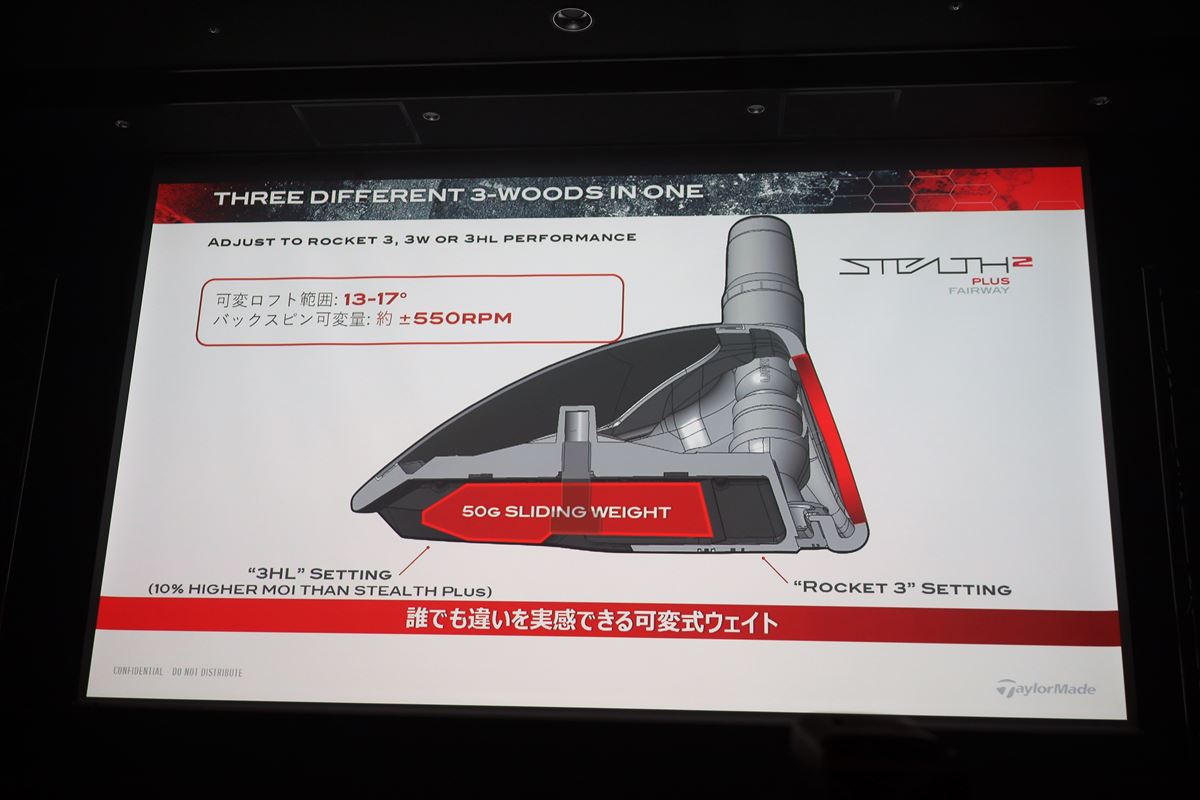 アスリート向けの「ステルス2 プラス フェアウェイウッド」(6万500円~8万300円)はソール部分にウェイトを前後に調整できる「スライディングウェイト50g」を搭載し、ロフト・ライ調整機能との組み合わせでボールの打ち出し角とスピン量を自分好みに調整できます。