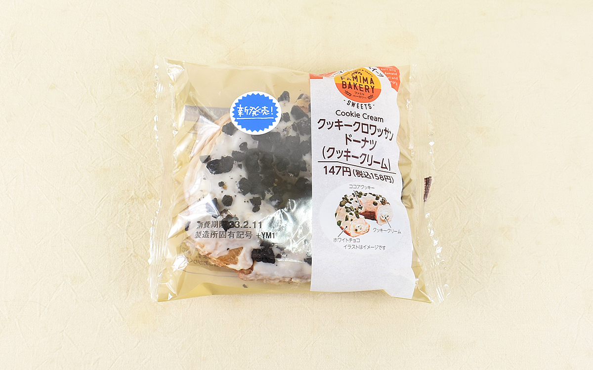 ドーナツといえば朝食にパっといただいたり、コーヒーブレイクにぴったりの洋菓子。専門店には多種多様な商品が並び、思わず目移りしてアレもコレもと選んでしまう人が多いのではないでしょうか。今回セレクトしたファミリーマートの「クッキークロワッサンドーナツ(クッキークリーム)」(158円/税込)も、ビジュアルの段階から目を引き寄せられる商品。いったいどのような味わいを楽しませてくれるのでしょうか。