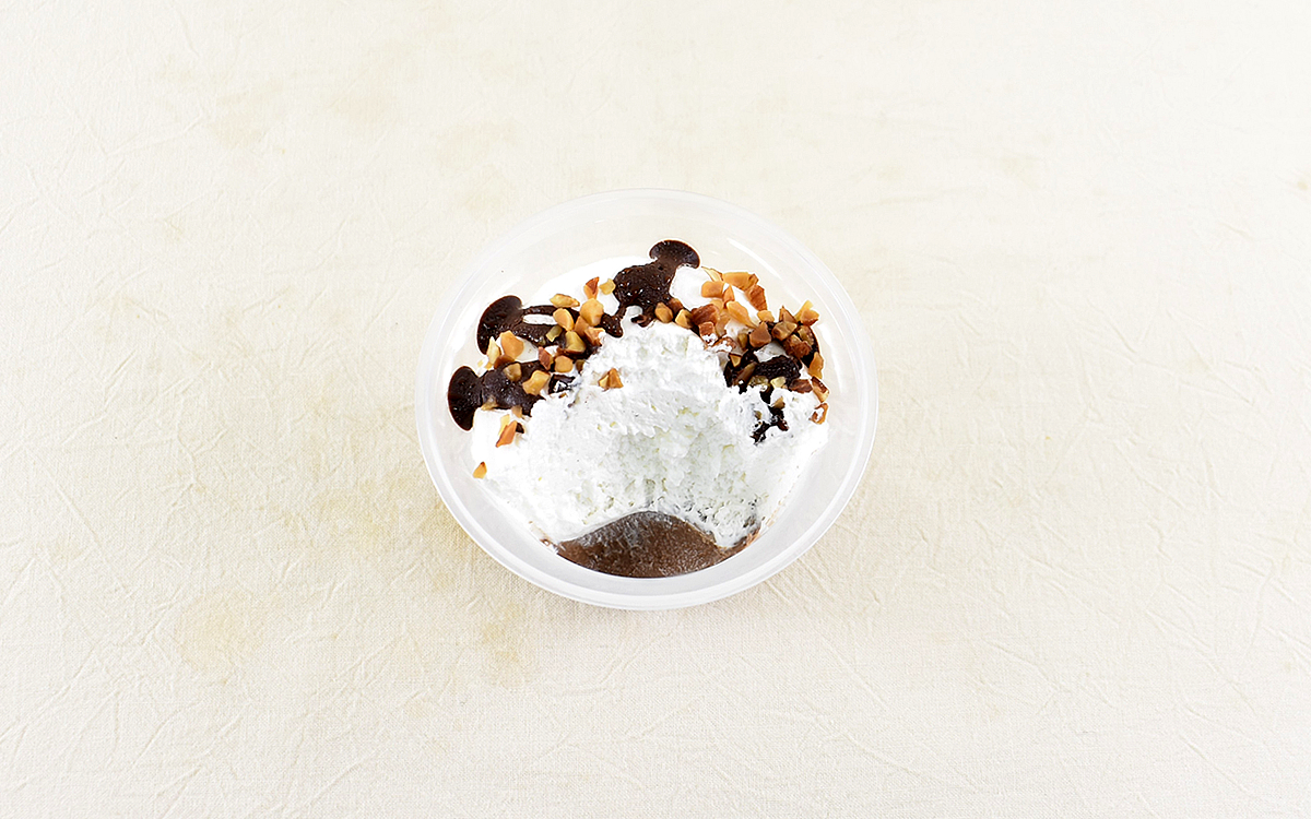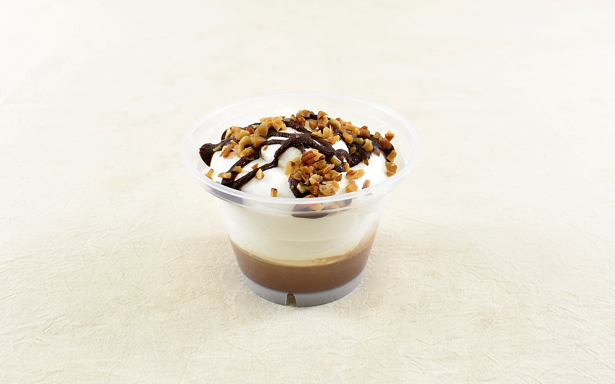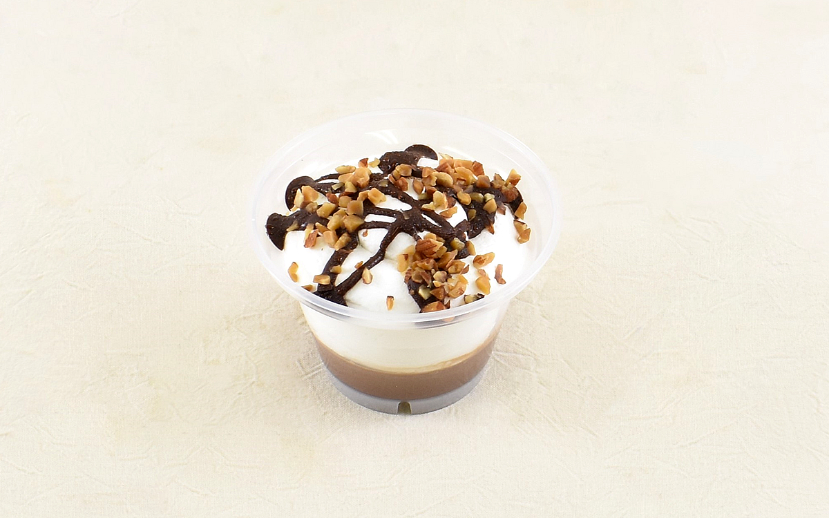 それでは商品をいただいていきましょう。クリームの上にはチョコソースとアーモンドチップがトッピングされていて、見た目の彩りも豊かに。さっそくスプーンを差し込んだクリームはふわっとしていて、一口いただいただけでクリーム特有の甘みがやさしく広がっていきます。