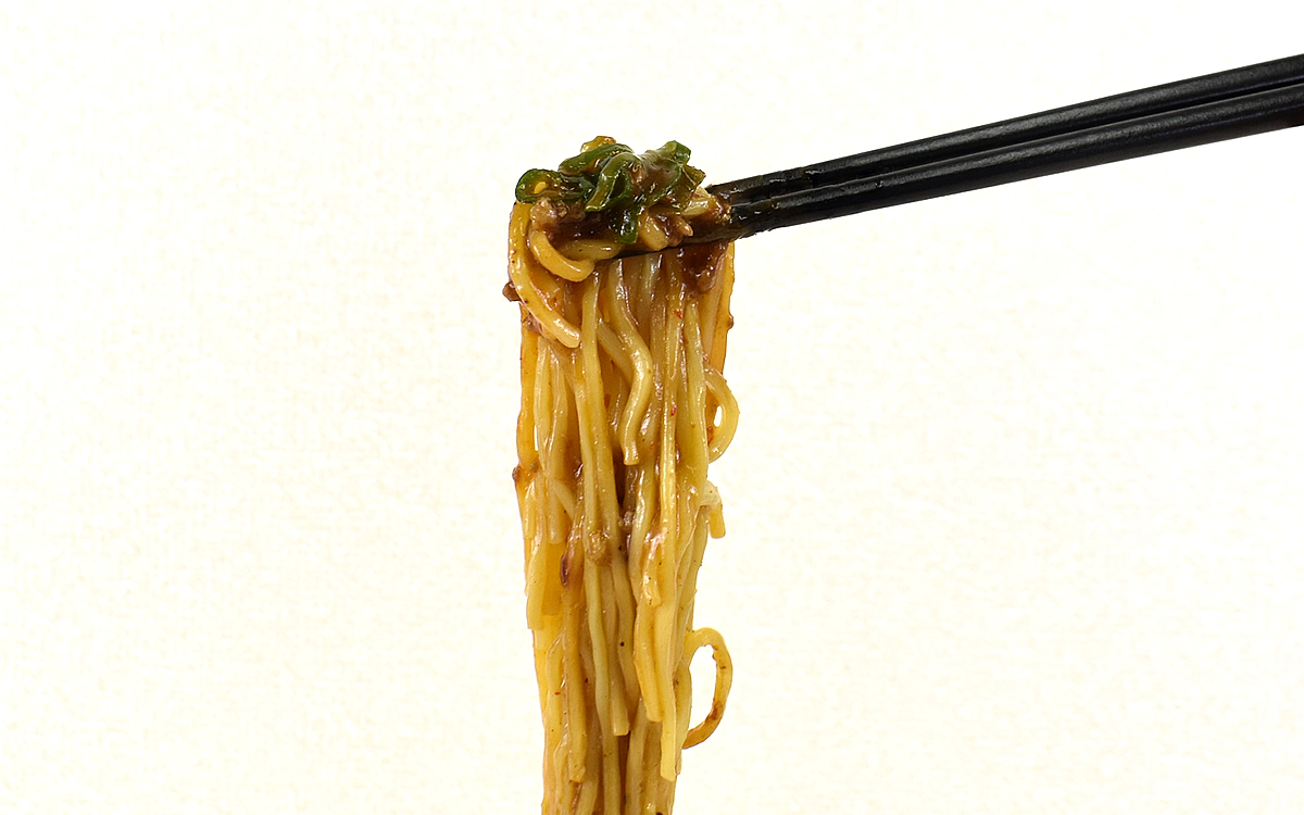 レンジ加熱後(目安時間 500Wで5分30秒)にスープと具材を合わせると、湯気に乗って豆板醤のこうばしい香りがふわり。さっそく麺を一口いただいたところ、コクを感じたのと同時にビリビリッ! と強烈な刺激が口の中を覆っていきました。注意書きが添えられているとはいえ、想像以上の辛さに思わずびっくり。