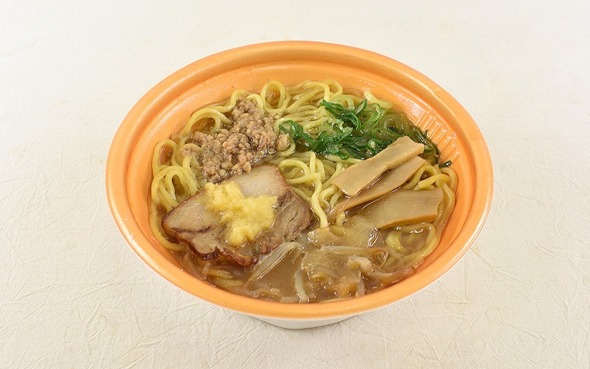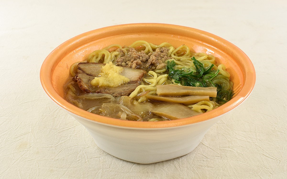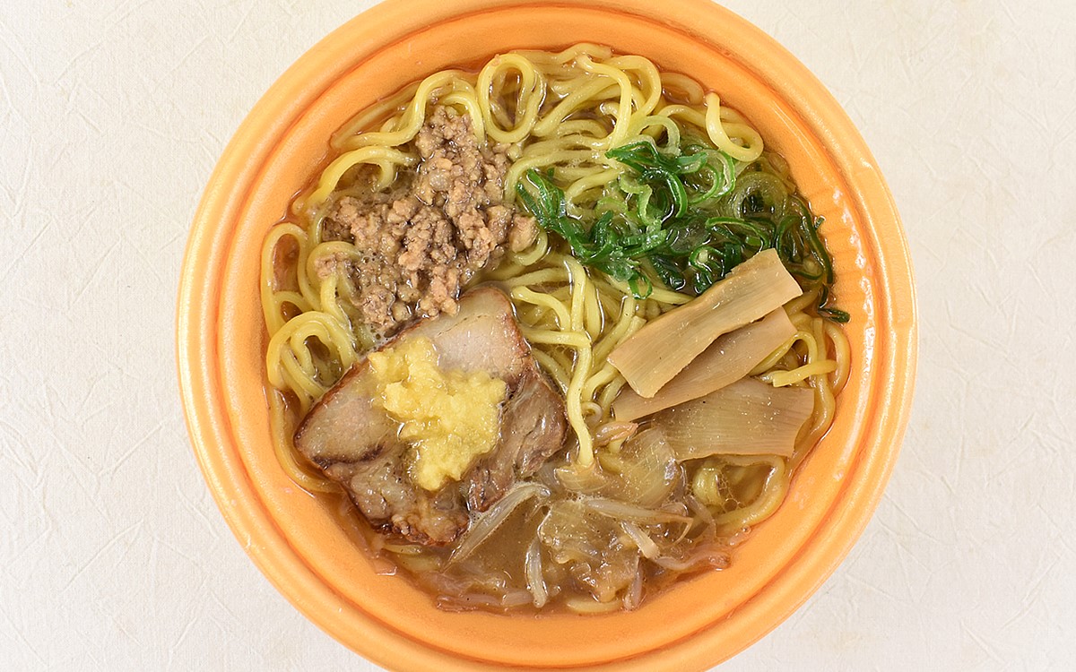 レンジで加熱調理(目安時間 500Wで5分)をおこなったところ、さっそく味噌の芳醇な香りが湯気とともに拡散。一口いただいたスープは見た目以上に濃厚なコクを放ち、味噌特有の甘みがあっという間に口の中を覆い尽くしていきました。スープは油が多いもののクドさは感じず、むしろ味噌の風味を際立たせることに。トッピングのおろし生姜もバランスがよく、奥深さを増すスープの味わいがたまりません。