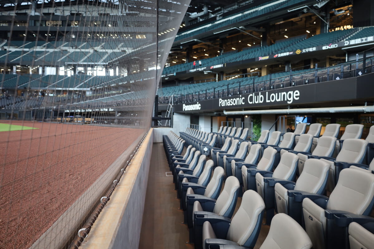 このラウンジは、3塁側ダグアウトクラブシートのチケットを購入した人のみが利用できる。ダグアウトクラブシートはラウンジと直結していて、選手目線での観戦が楽しめるプレミアムシートだ。エスコンフィールドのファウルグラウンドにはレンガを砕いて作られた砂が使用されているのだが、選手たちのプレイの拍子に、シートに砂がかかってくるという。この座席はそれほどに、選手たちに近い場所なのだ。