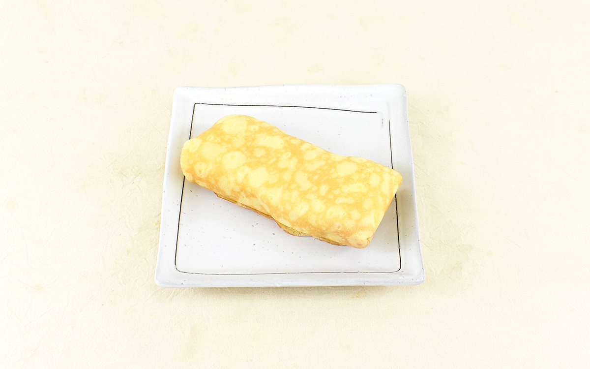 パッケージから取り出したクレープは手のひらに収まるほどのサイズ感で、きれいな焼き色に思わず目を引き寄せられます。トレイから皿に移し替えてみましたが、手に一旦乗せただけで伝わってくるクレープのやわらかさ……さっそく縁からがぶりとかじりついてみたところ、クレープ生地特有の甘みがじんわりと口の中へと広がっていきました。