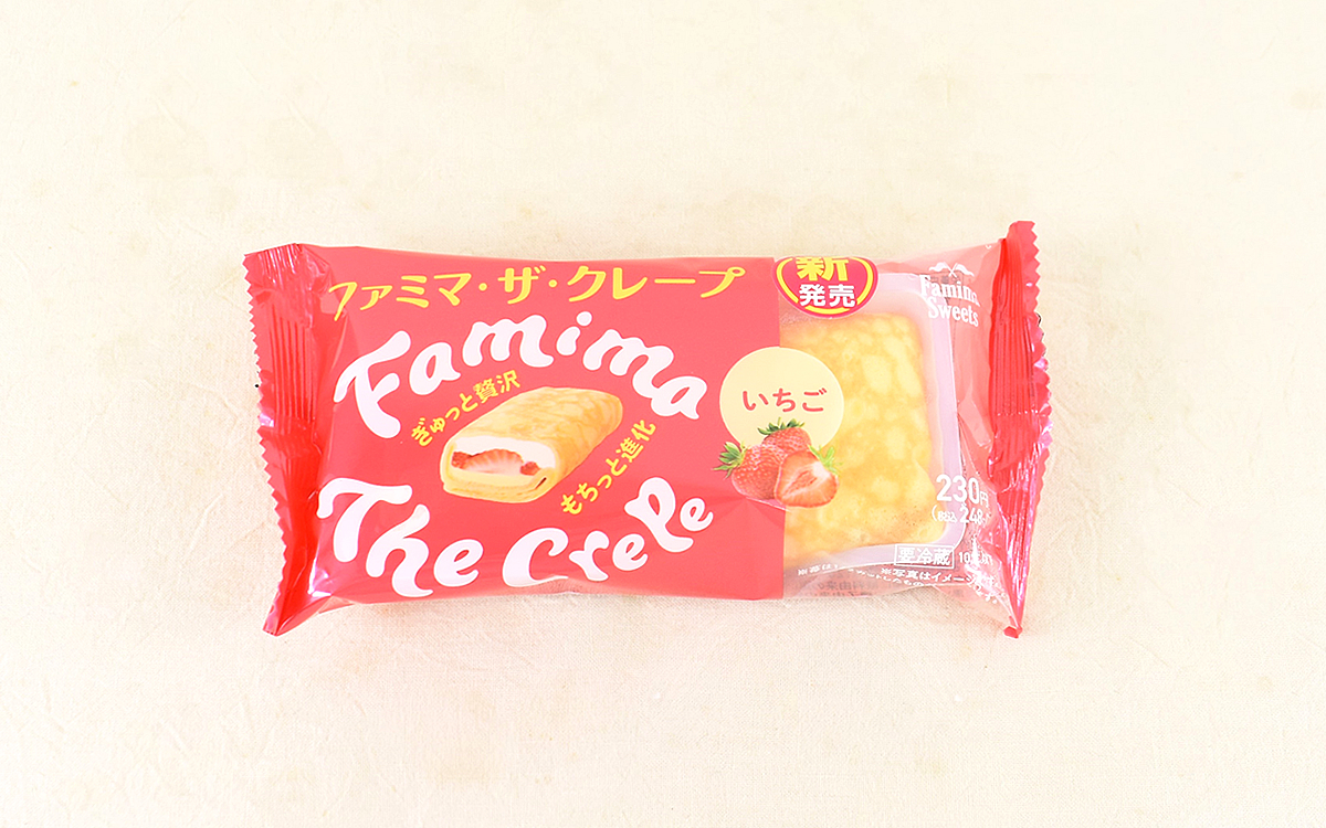 ファミリーマートでは2022年6月より「ファミマ・ザ・クレープ」の販売を開始し、2023年2月26日時点でなんと1700万食を突破。食感・味・見た目が楽しめる商品として、“ファミマの定番スイーツ”の地位を確立しました。「ファミマ・ザ・クレープ」の特徴は、なんといってもクレープ専用ミックス粉を使用したモチモチ食感の生地。そんな大ヒットシリーズに加わった新フレーバー「いちご」の味わいはいかに?
