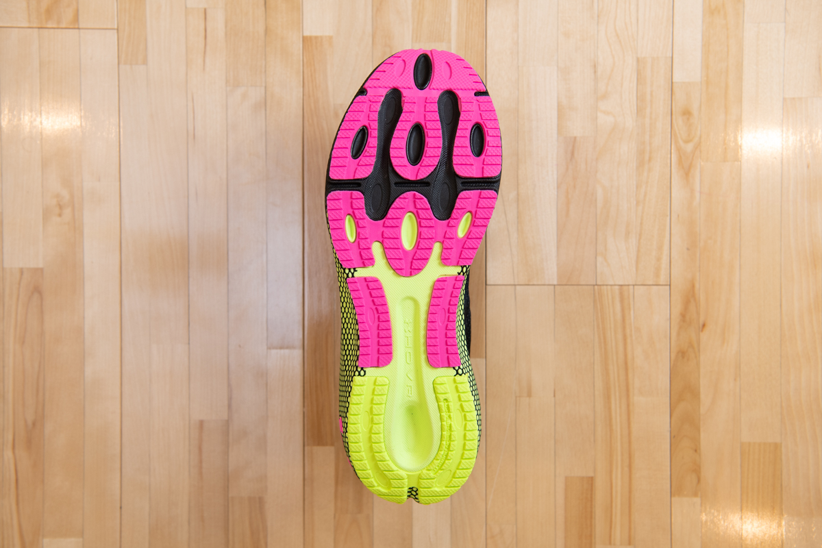 「踵から中足部にかけてのグリーンのホバーには、クモの巣状にウェブを被しています。ホバーフォームは軟らかいため、チカラを横方向に逃さない工夫です。ホバーフォームは、とりわけ衝撃吸収性が高く、ウェブを壁にして力を止めないと、沈み込み続ける特性があります」(松原さん)