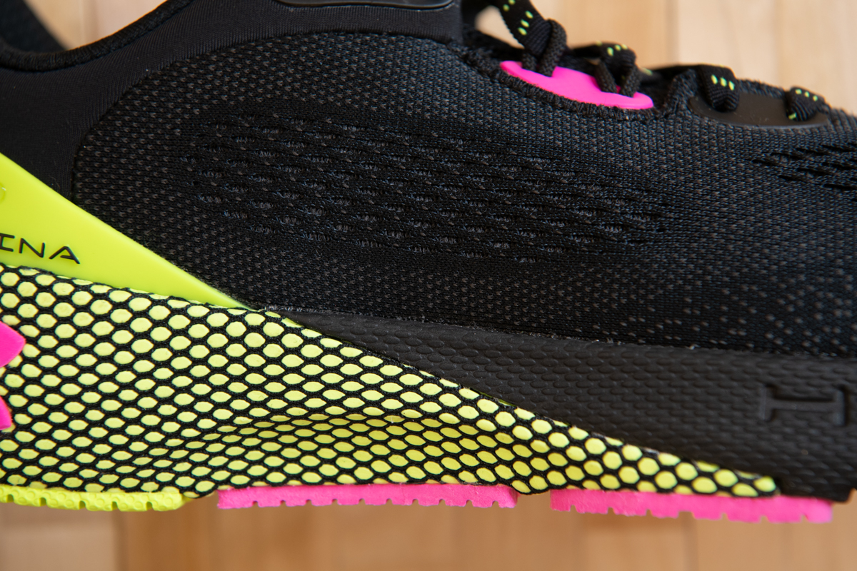 アッパーは、今や各社がこぞって採用するエンジニアードメッシュを使用(UAではワープニットと呼ぶ)。文字通りニット(編みもの)なので、通気性を持たせる部分は粗く編み。サポートが必要な強度を持たせる部分は編目を密に変えられる特徴がある。軽量化と通気性を兼ね備えられるのだ。