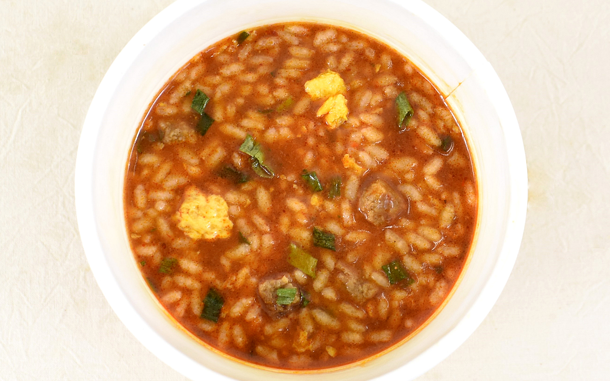 セブン-イレブンで見つけた「日清炎メシ 辛うまユッケジャン」(261円/税込)も、手間なくサっといただける商品のひとつ。「炎(ホムラ)メシ」「辛うま」と銘打つほどの味わいを、じっくり確かめていきましょう。