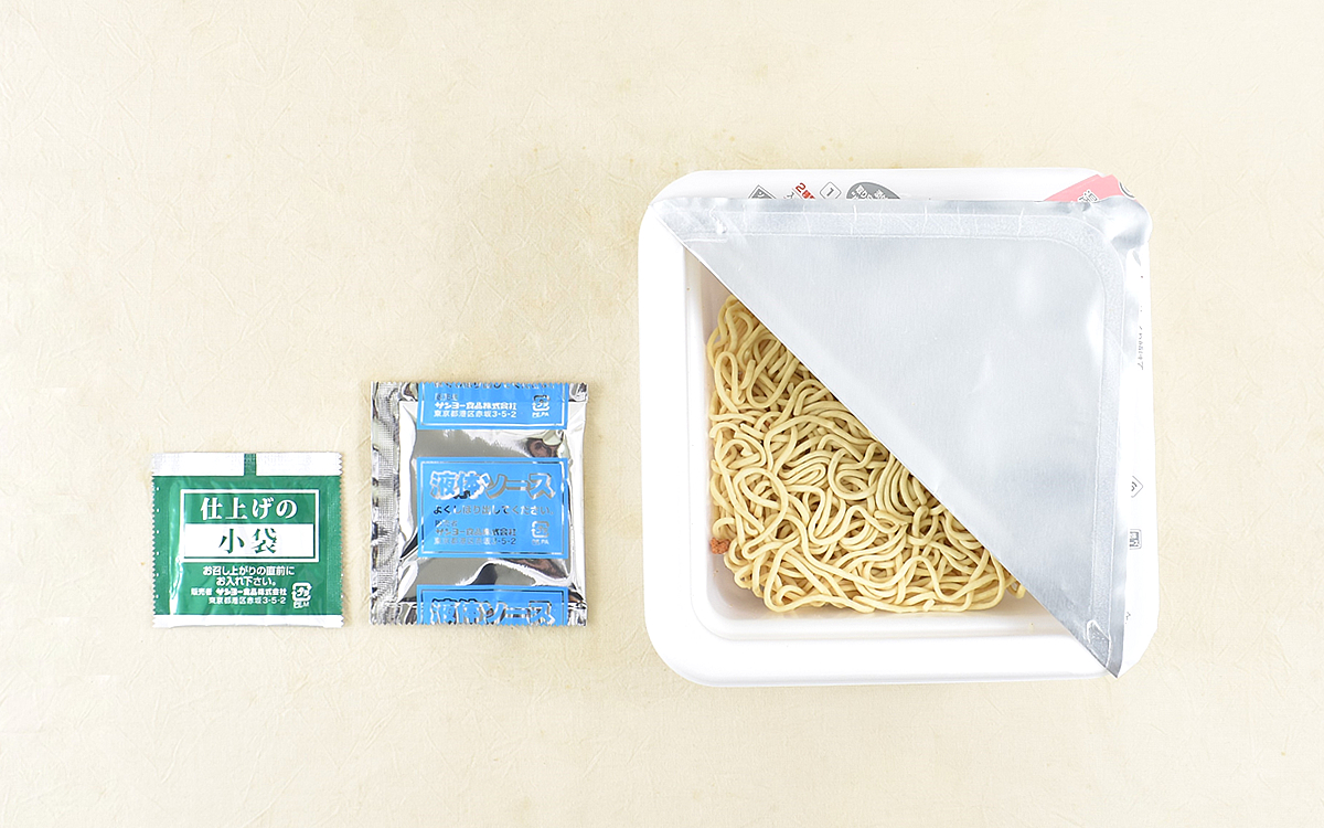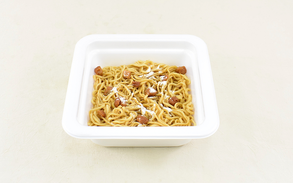 パッケージに同封されているのは液体ソースと仕上げの小袋。熱湯調理(4分)を経て麺に投入すると、さっそくチーズの香りが室内に広がっていきました。焼そばといえばウスターソースが一般的なのでイメージを掴めないまま一口いただいたところ、香り以上に濃厚なチーズのコクが炸裂。さらにチキンエキスの旨みも重なるため、想像以上に深みのある味わいが口の中を覆い尽くします。