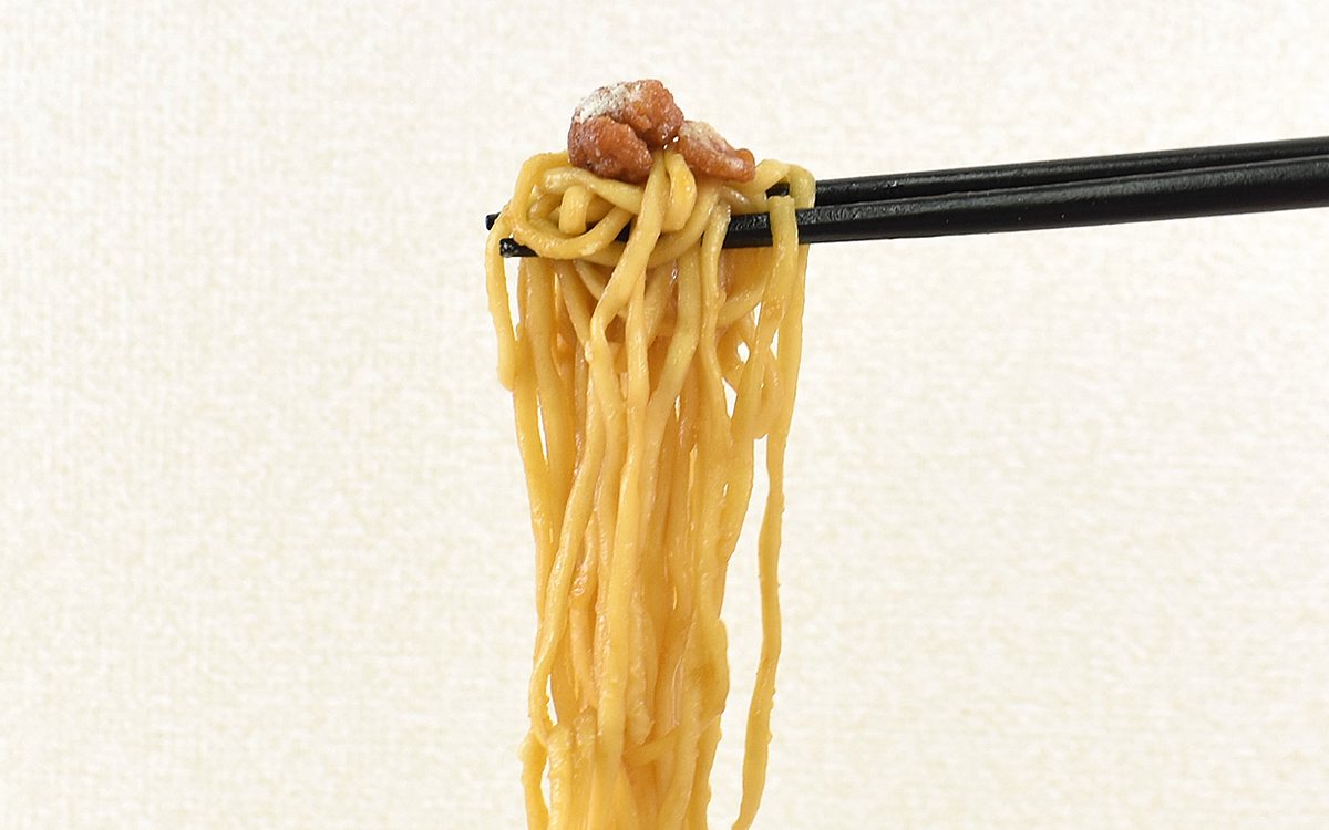 商品に使用されているのは油揚げ麺ですが、ノンフライ麺に負けないぷりぷり食感が魅力的。麺全体がソースの油をまとうため口あたりがよく、弾力のある食感と歯切れの良さを感じながら楽しむスノーウィングチキン風の味わいがたまりません。