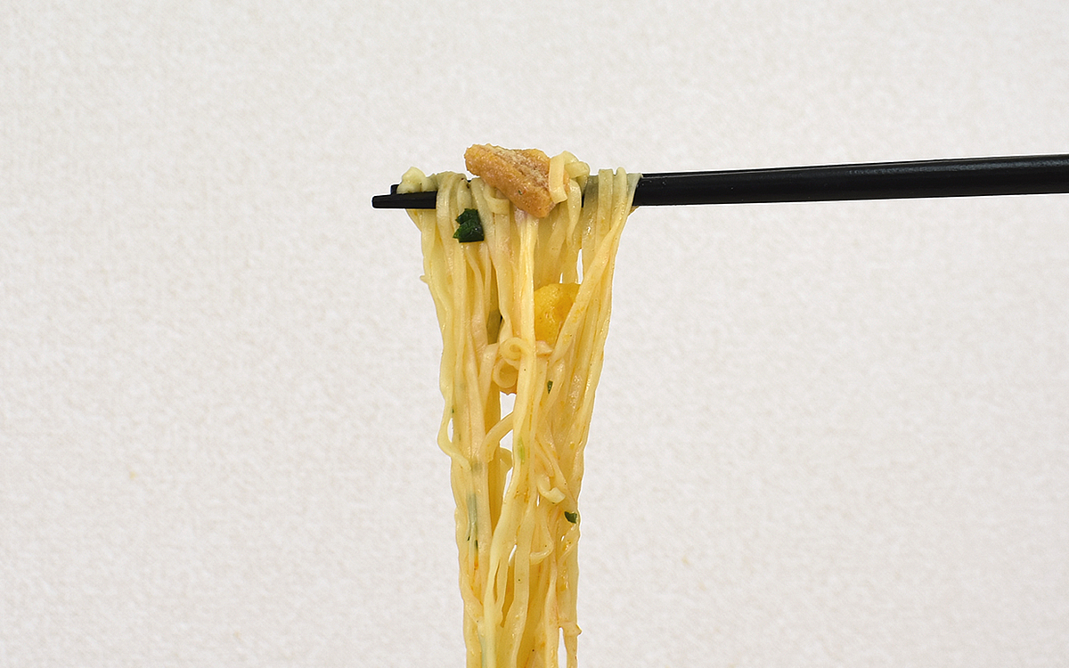 同商品に使用されている麺は従来の「カップヌードル」でもお馴染みで、しなやかさとコシのある歯ごたえが魅力。スープをまとうことで“つるみ”が増した食感も印象的です。麺の硬さはやわらかめ・普通・硬めと人それぞれながら、敢えてやわらかめにすることでスープとともに織りなす口あたりがよりなめらかに。