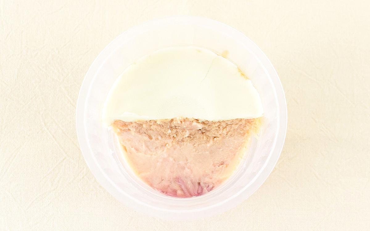 それではさっそく「ホワイトチョコがけイチゴプリン」をいただいていきましょう。フィルムをはがして最初に目に飛びこんできたのは、表面を覆うホワイトチョコの層。ソースと違ってしっかり厚みがあり、スプーンを当てたところチョコがパキっと割れる感触が手に伝わってきました。もちろん食感もよく、まろやかな口どけ感が印象的。ミルクチョコとは一味違うコクのある甘みがじんわりと口の中に広がっていきます。