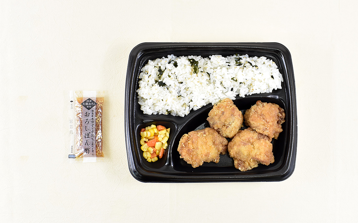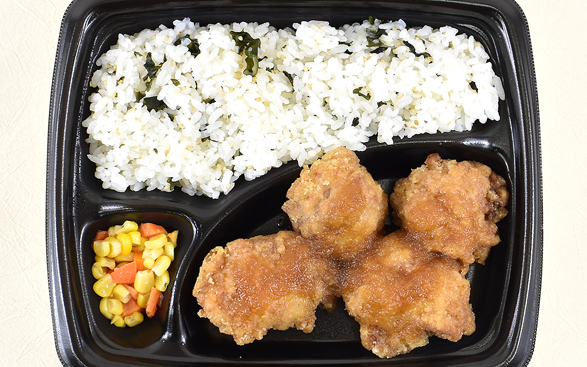 同商品は竜田揚げや付け合わせのバター風味コーン人参和えとともに、わかめとごまが混ざった味つけご飯も盛りつけられているのがポイント。口に運ぶとほのかに磯の風味が広がっていき、竜田揚げと併せてお腹を満たしてくれました。