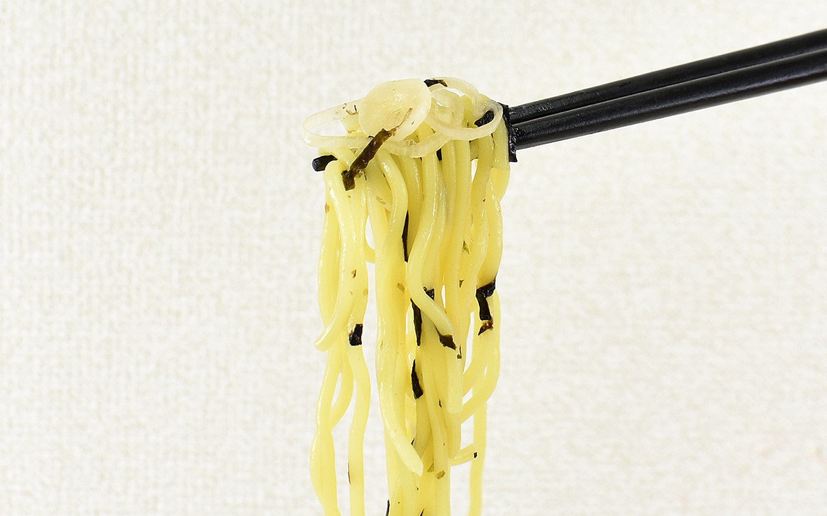 とはいえ思っていたほどごま油が極端に主張してくるわけではなく、ラー油の風味がきゅっとつゆの味を引き締めることに。また添付のコショーを加えると、ピリっとした刺激も楽しむことができます。さらに驚いたのが、きざみのりを加えた後の味わい。磯の香りが馴染むことで生まれるつゆの奥深さがたまりません。