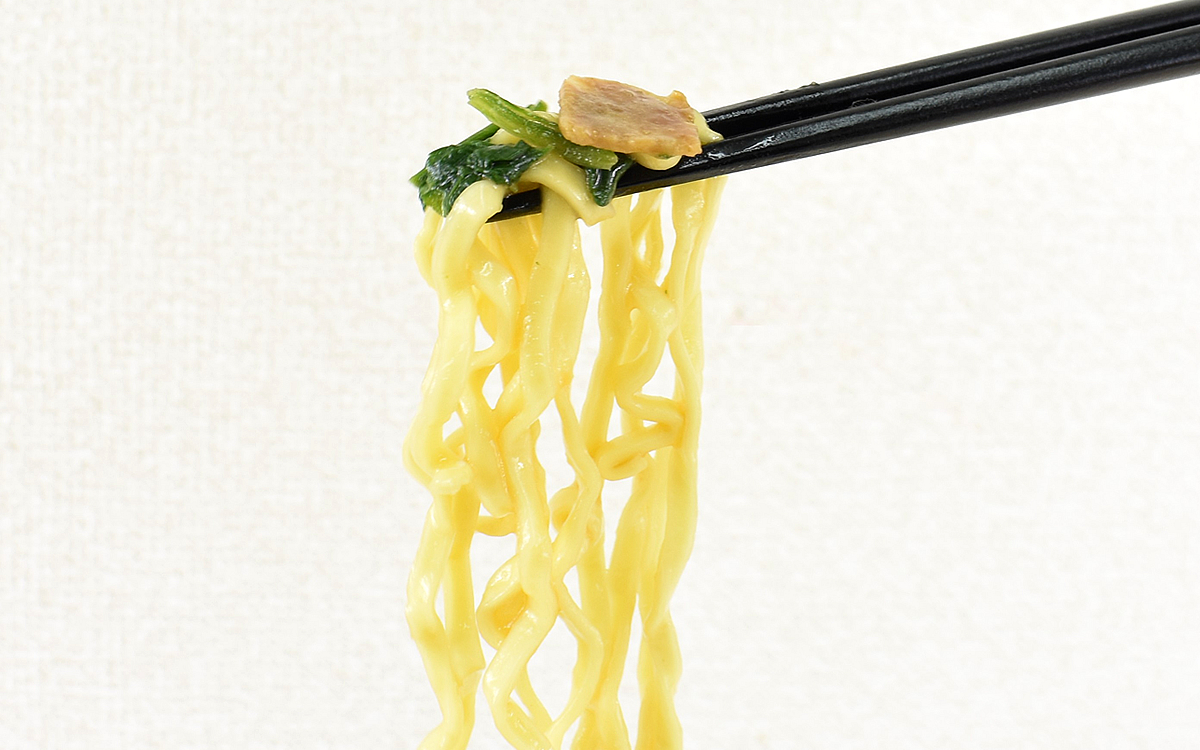 それでは「横浜家系 豚骨醤油ラーメン」をいただいていきましょう。同商品には仕上げの調味油が添付されているので、熱湯調理後(5分)のラーメンに投入。見るからに濃厚なスープや具材のほうれん草もさることながら、家系らしい極太麺に目が引き寄せられます。使用しているのはノンフライ麺で、さっそく口へ運んでみたところ弾力がしっかりあって食べごたえ抜群。モチモチ感を備えつつ歯切れがよく、麺を噛むごとにスープの味わいが広がっていきました。