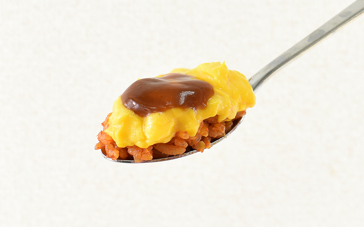 まずはレンジで加熱調理(目安時間 500Wで4分)をおこなったところ、チキンライスのこうばしい香りが漂ってきました。一方デミグラスソースのかかった玉子は、加熱してもトロトロ感をキープ。さっそくスプーンですくい上げて口に運ぶと、見た目以上にふわっとした食感に驚かされます。玉子のコクを感じさせつつ、バターの塩味と甘みでバランスよく整えられた風味もGOOD。