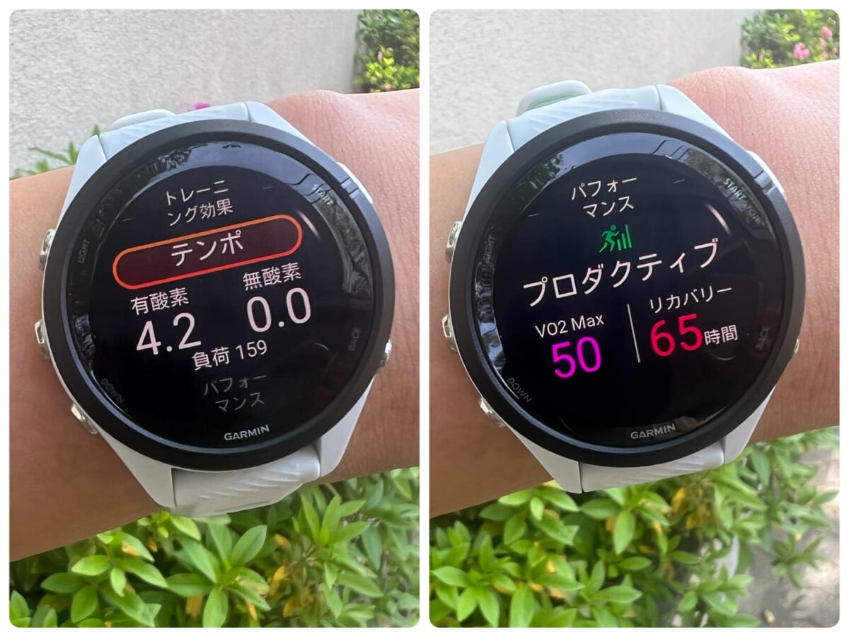 Forerunner 265Sのコーチングを聞き、おすすめのトレーニングをしたから、“プロダクティブ”と出ているんですね。しっかりと負荷のある練習ができたようで気持ちの充実度も上がりました。リカバリー65時間と出ているので、しっかり休息も取ることにしました。