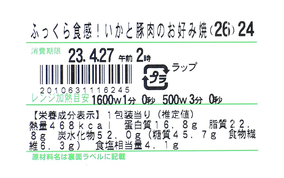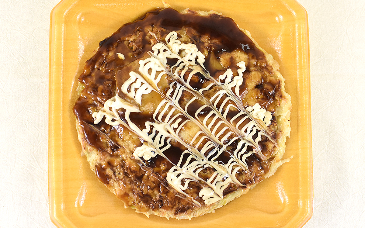 パッケージを手に取った瞬間から、ズシリと重みが伝わってくる同商品。たっぷりかかったお好み焼ソースに加えて、きれいな模様を描いたマヨネーズのラインにも目を引き寄せられます。お好み焼はいうなればコンビニ弁当の定番メニュー。とはいえファミリーマートは生地・製法・ソースにこだわった「俺の豚玉」や人気お好み焼店とのコラボ商品をヒットさせているため、品質は保証付き。「ふっくら食感! いかと豚肉のお好み焼」がどのような魅力を備えているのか、じっくり確かめていきましょう。