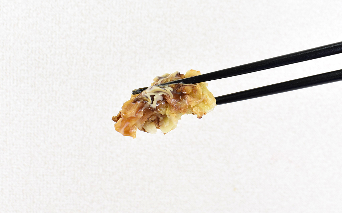 まずはレンジで加熱調理(目安時間 500Wで3分)をおこなったところ、ソースの芳醇な香りがふわり。縁から切り取って口に運んだ生地は、思いのほかだしが効いていて驚かされます。ただそれ以上にインパクトをもたらしたのが、「ふっくら食感!」の名に相応しい歯ごたえ。パサパサと粉っぽいわけではなく、かといってベタベタしているわけでもない絶妙なバランスがGOODです。