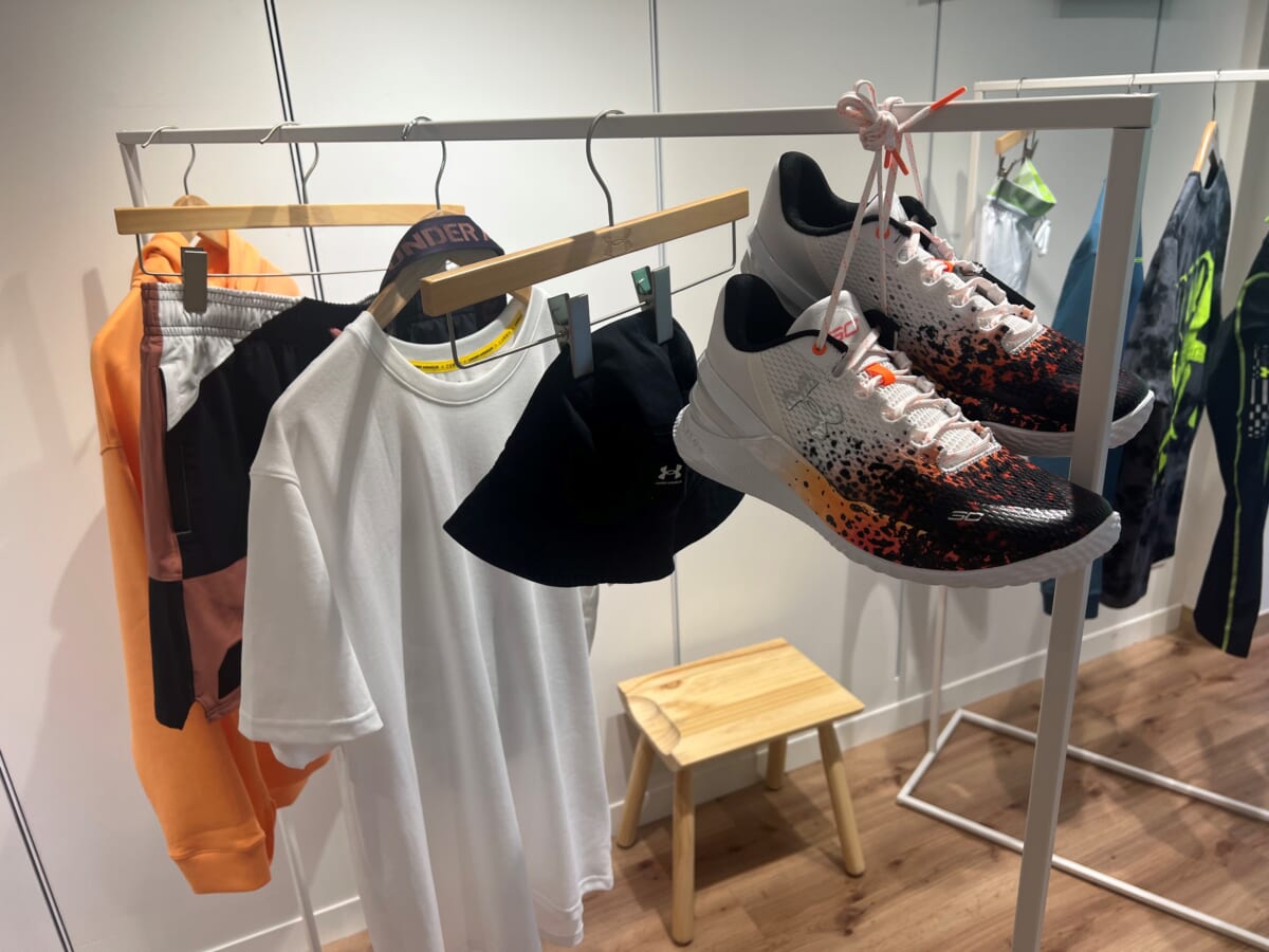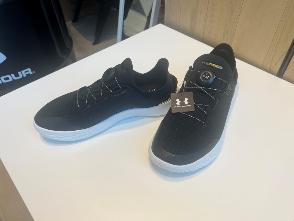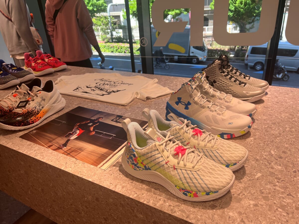 アンダーアーマーといえばバスケットボールのステフィン・カリー選手! カリー選手のシグネチャーシューズ「カーリーフロー10」(2万900円・税込)をはじめとするバスケットボールシューズも並んでいました。