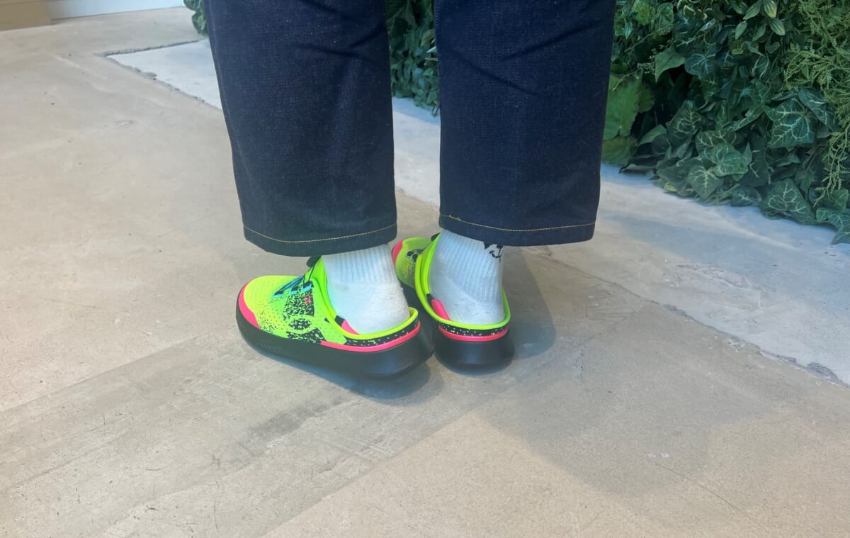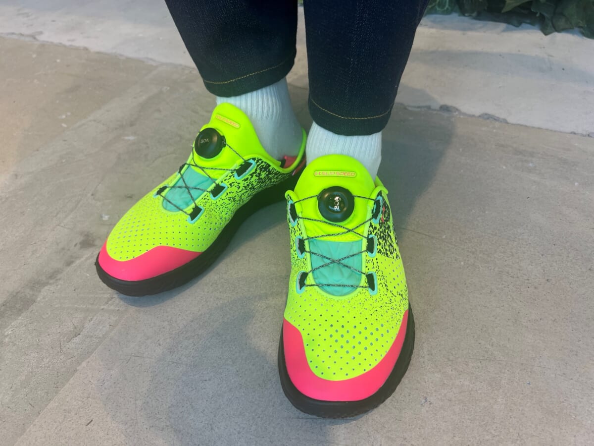 私が履かせていただいた目の冴えるようなLime Surgeというカラーのほかに、いろいろなスタイリングにも合わせやすいBlackもあります。(写真にはありませんが白地にかかと部分がピンクのPink Shockというカラーもあります。)