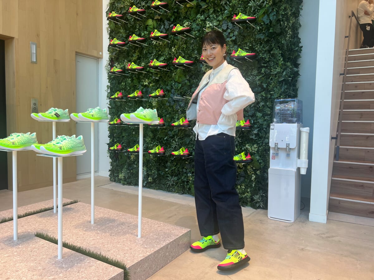 コンセプトは公園。誰もが公園のように気軽に立ち寄れるように、グリーンのシューズウォールや多数のチェア、ウォーターサーバーが配置されています。ランナーが水分補給のために立ち寄るのもOKとのこと。