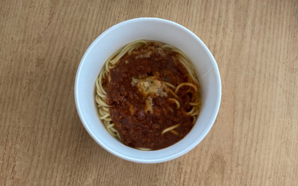 ボロネーゼソースはパスタの上に備え付けられたトレーにのっています。レンジで温め、蓋を開けると「スープパスタだったっけ?」と一瞬疑ってしまうほどのボロネーゼソースの量。しかもソースの上に乗せられたチーズが溶け出して熱々のトロトロです。ボロネーゼの芳醇な香りで食欲をそそられること間違いなし。