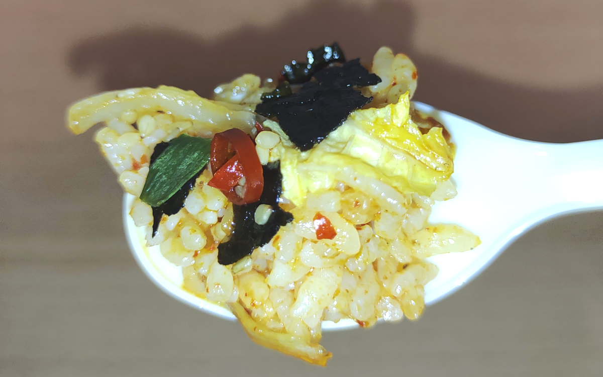 ご飯はどちらかというとふんわりした印象で、脂っぽさはそこまで感じません。キムチは非常にシャキシャキ感があり、口の中で豊富な食感を楽しめますよ。