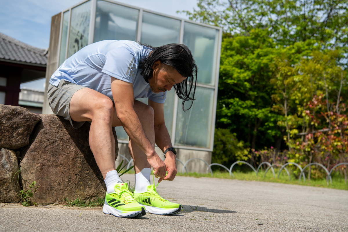 人気ブランドであるアディダスの最新シューズだけに、足入れの期待は大。さっそく「アディゼロ SL」に足を入れる。ガチのレースシューズのような、細めの平ひもをキッチリ結んで立つと、ミッドソールのフォーム材「ライトストライク EVA」が体重を受け止め、やんわりと沈み込む。
