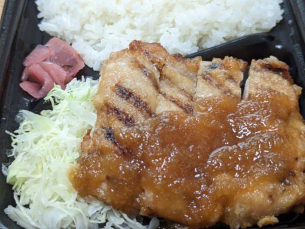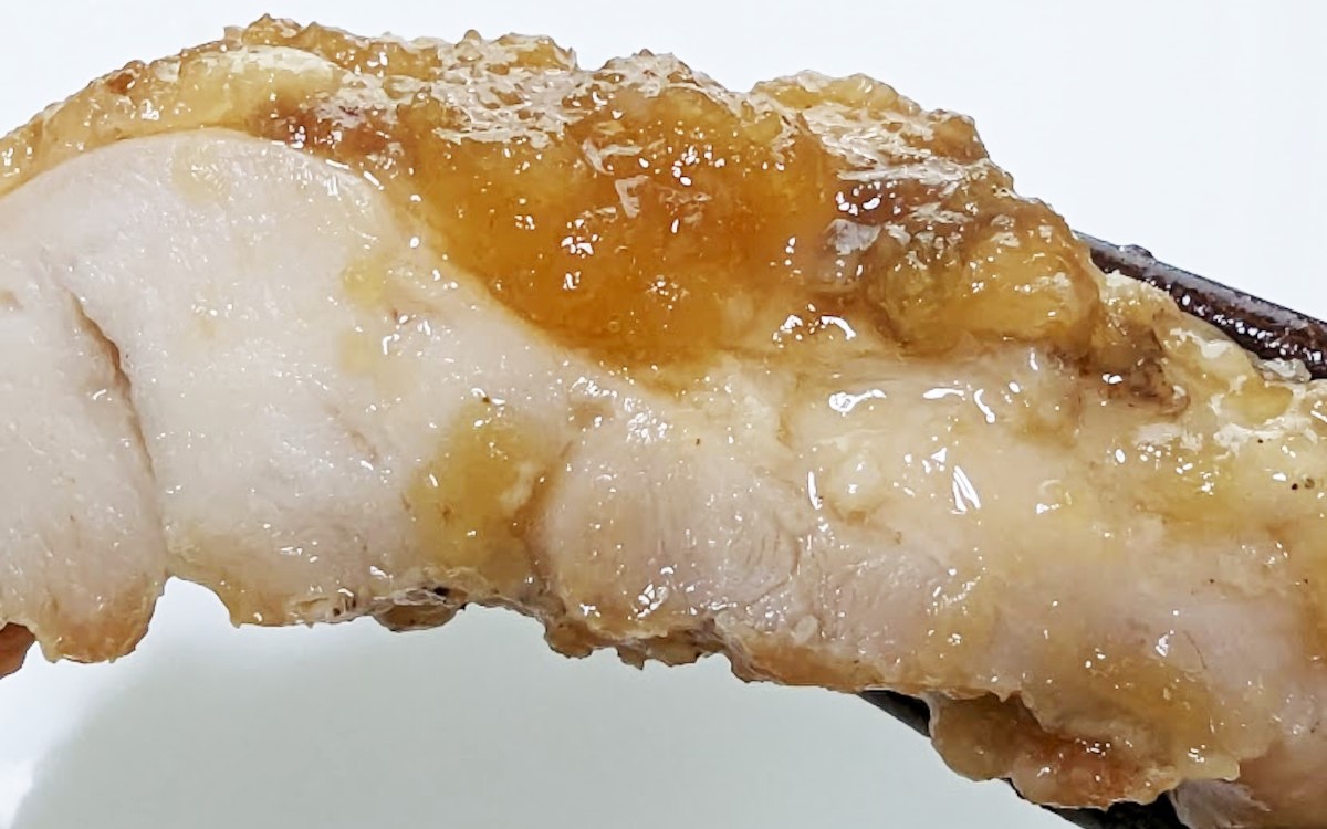 大きな鶏肉は、わりと肉厚なので満足感も十分です。大きめにカットされているので、箸で持つとズシっと重みを感じるほど。一度では口に入らないためガブっと噛んでみましたが、やわらかいので皮まで簡単に噛み切れました。ほんのり酸っぱいポン酢ソースが、ごはんを一口、二口と運ばせます。