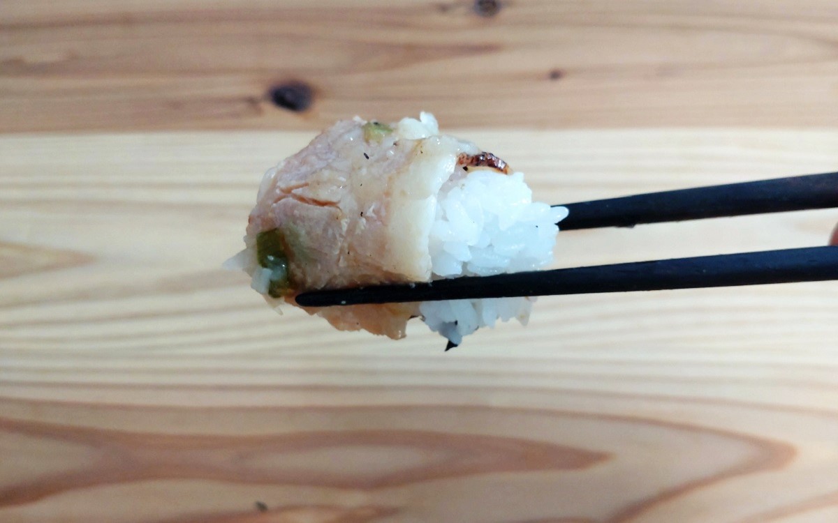次にねぎ塩味の方を食べてみましょう。ひとくち食べるとニンニクのパンチとネギのさっぱり感、ごま油のコクが口の中に広がりました。ちなみに醤油ダレは豚ロース肉ですが、ねぎ塩ダレは豚バラ肉。豚バラ肉の脂っぽさをねぎ塩のさっぱり感が上手く中和してくれているわけです。