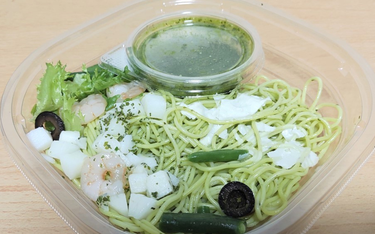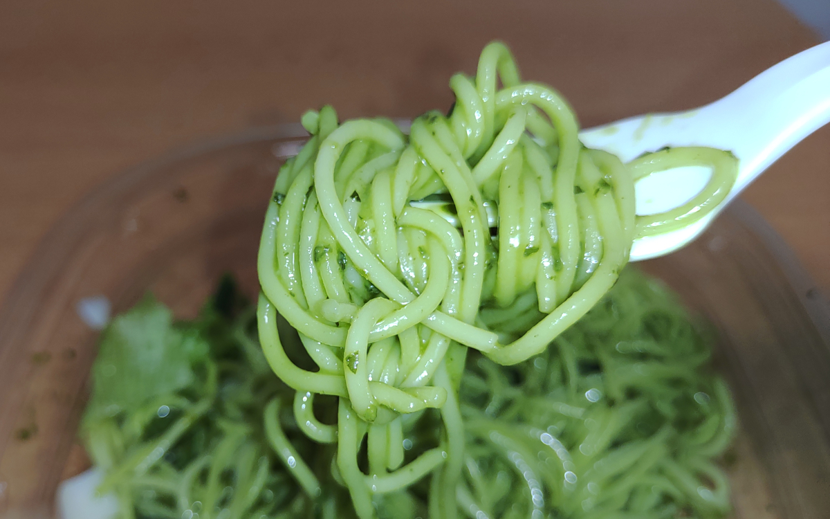 冷製パスタなのでもちろん温めはなし。冷えた状態で蓋を開封すると、食欲をそそるバジルとチーズの香りがふわりと漂ってきました。麺も含めてほぼ緑で構成された統一感のある色合いは非常にきれいで、健康的なイメージを与えてくれます。