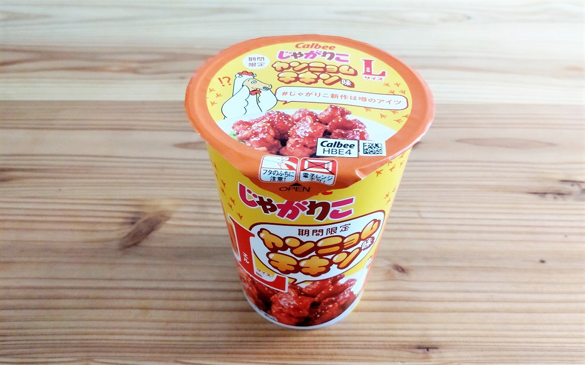 5月30日からは、ファミリーマート限定で「じゃがりこヤンニョムチキン味Lサイズ」(204円/税込)が発売開始。大好きな“ヤンニョムチキン味”とあって、さっそく購入してみました。