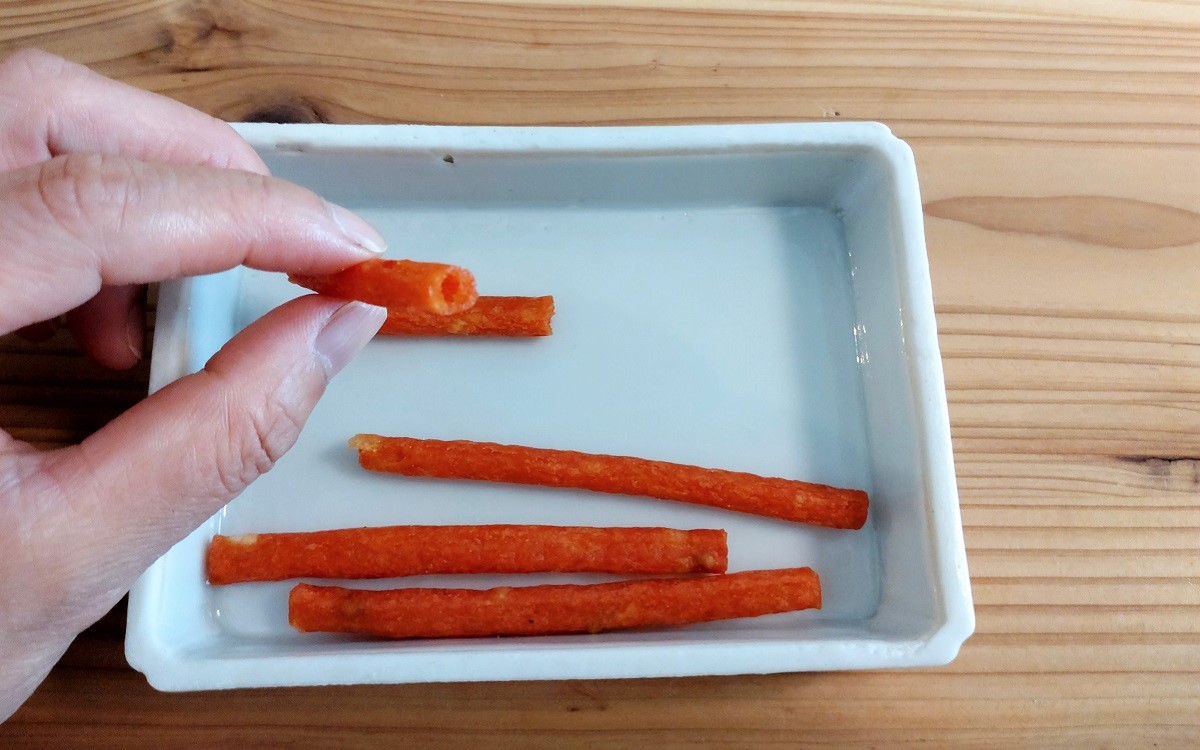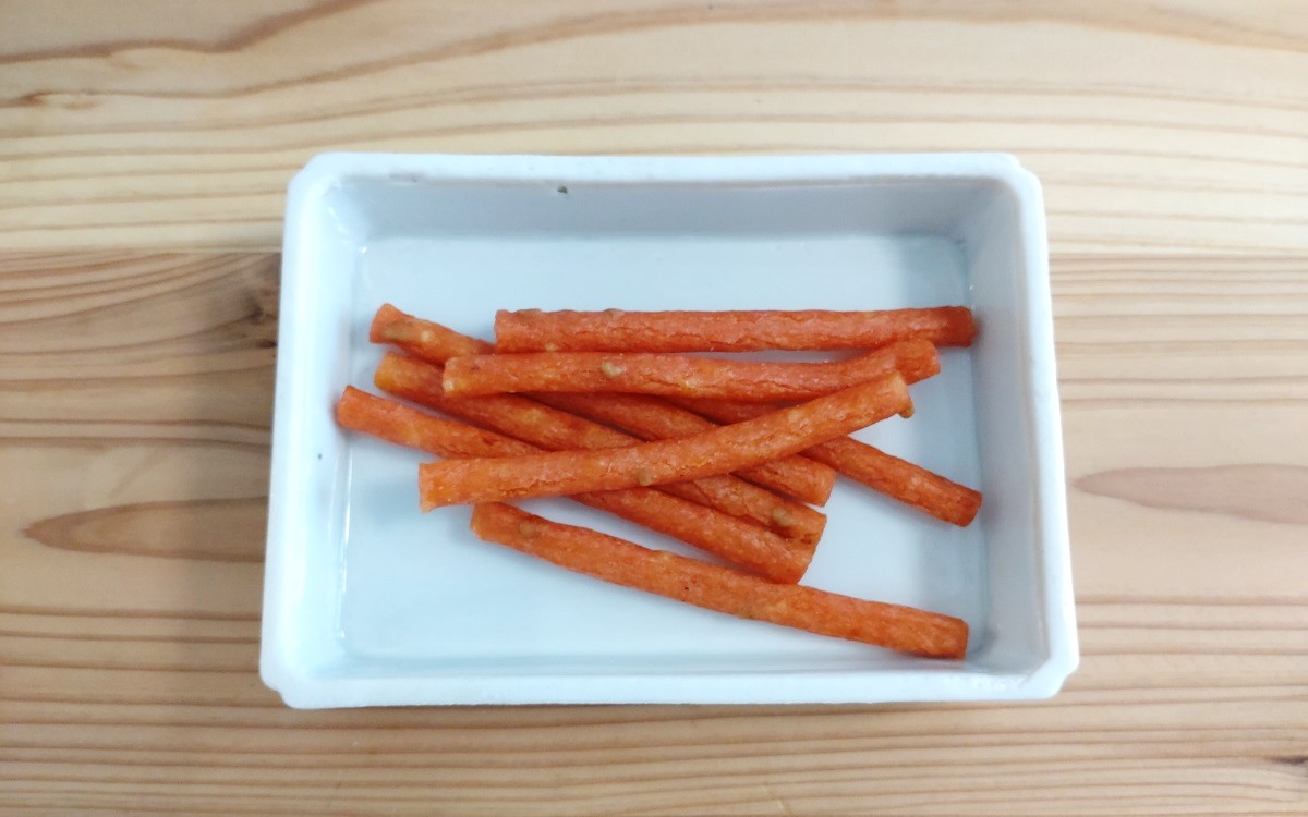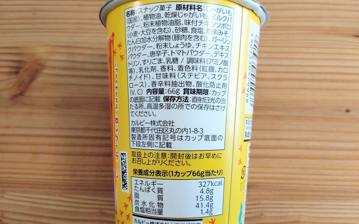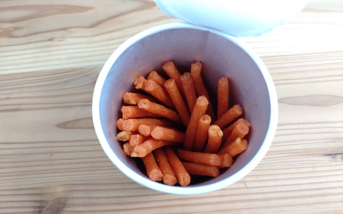 パッケージを開けると、「さすがヤンニョムチキン味」といった赤いビジュアルに期待大。ちなみにLサイズなので、通常の“じゃがりこ”よりは少しロングです。この時点では、コチュジャンやニンニクといったヤンニョムチキンを構成する香りはあまりしません。