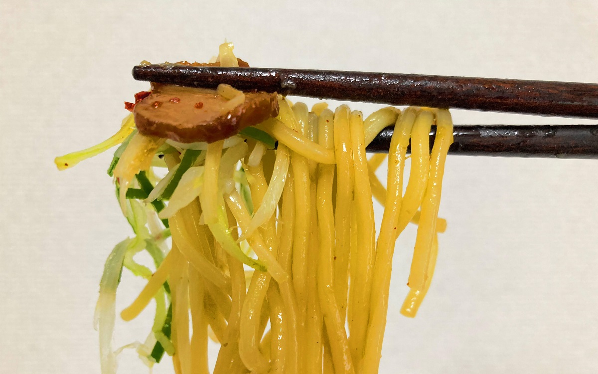 レンジで温めてフタを開けた瞬間、一気に漂ってくるごま油とねぎの香り。脂でつやつやに輝く麺がこれまた食欲をそそります。