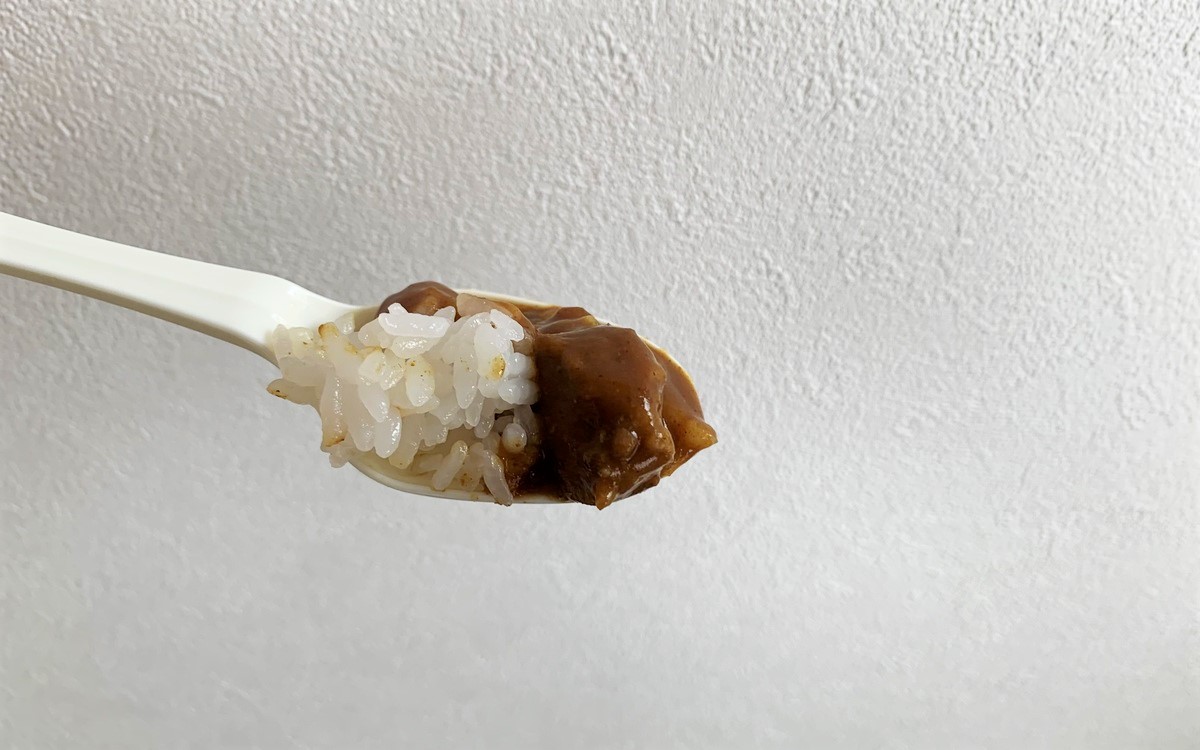 続いて口に入れたのはゴロゴロ入った牛肉です。じっくり時間をかけて煮込んだようなトロトロのお肉にビックリ。これがいくつも入っているので、見た目のコンパクトさとは裏腹に満足度の高い一品でした。