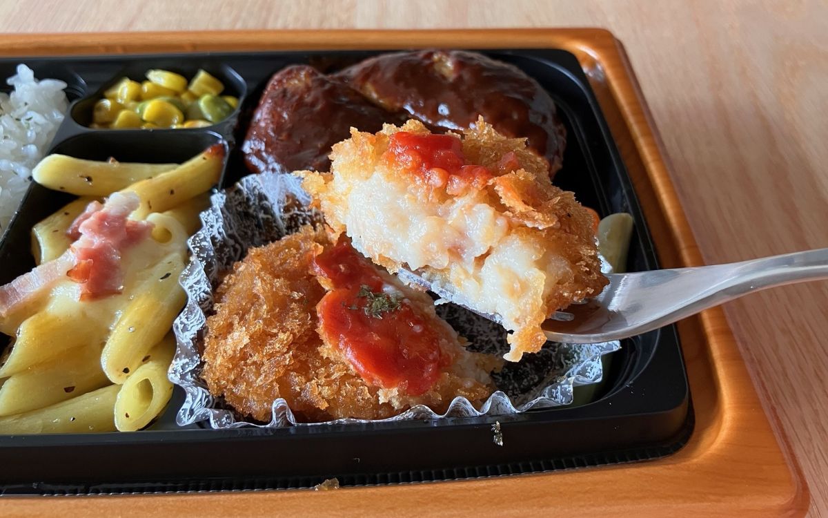 次はお待ちかねのカニクリームコロッケ。こちらもハンバーグに引けをとらない大きさです。ふっくらとした厚みがあり、測ってみたところ2.5cm! ハンバーグの厚みとほぼ同じでした。口に入れた瞬間にクリームソースのまろやかな風味が口いっぱいに広がっていきます。クリーミーでありながらしつこくなく、カニの風味がしっかりと堪能できますよ。