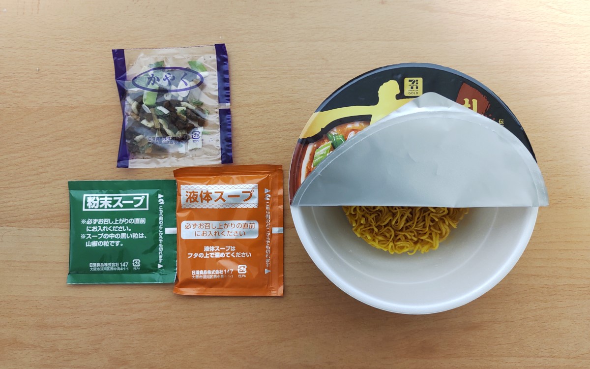 蓋を開けると、かやくと液体スープと粉末スープが入っていました。熱湯調理の時間は5分。5分後に液体スープと粉末スープを入れてかき混ぜれば、食欲をそそる野菜や肉、味噌の香りが漂います。