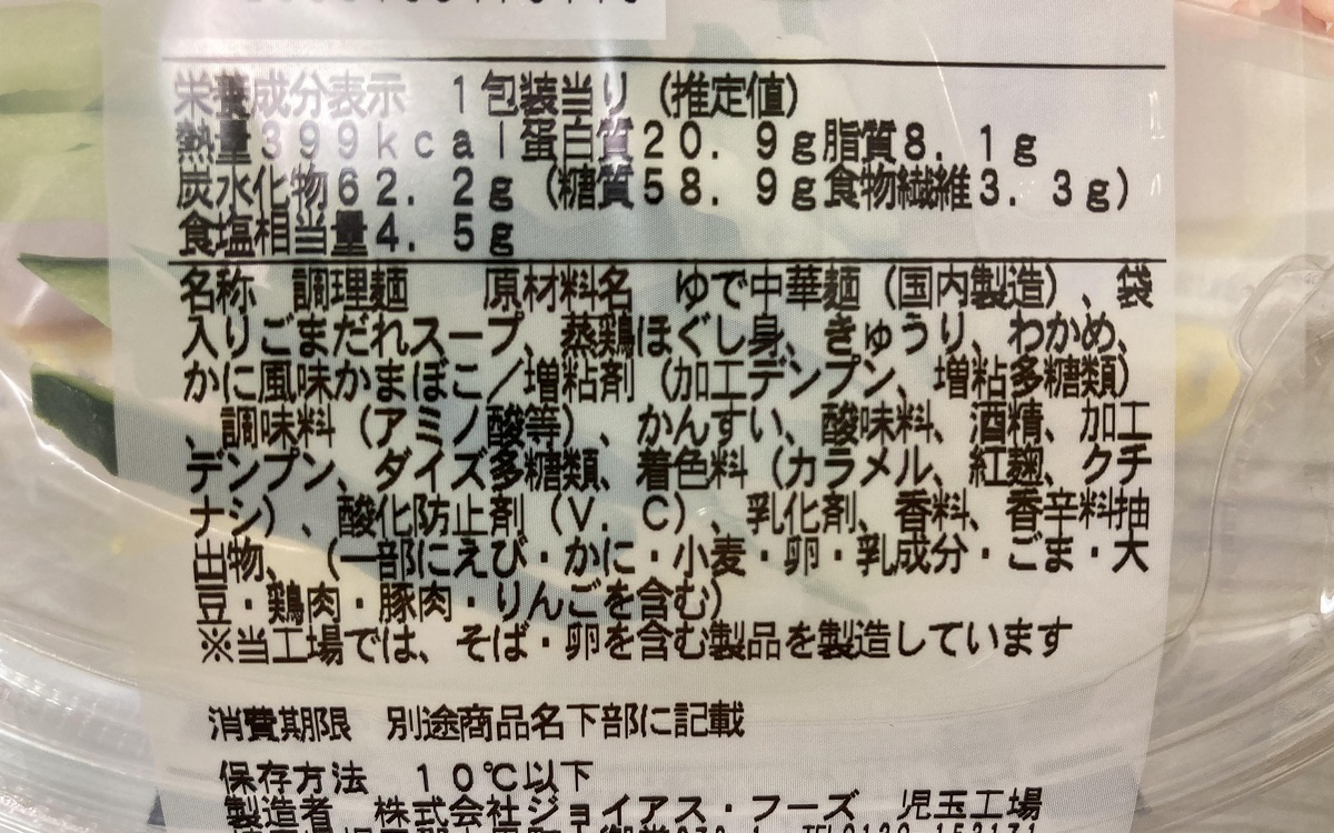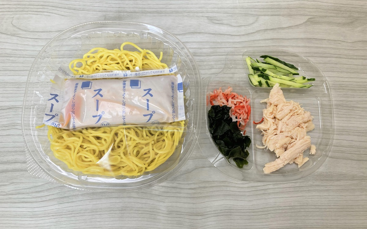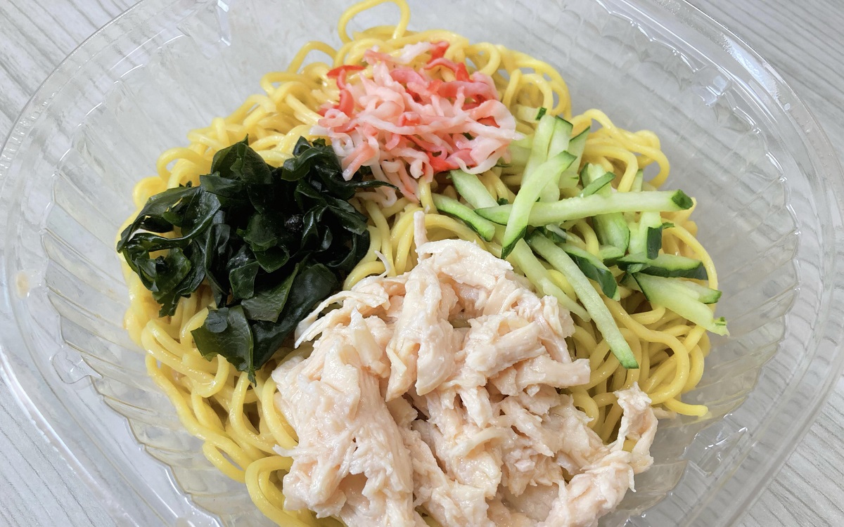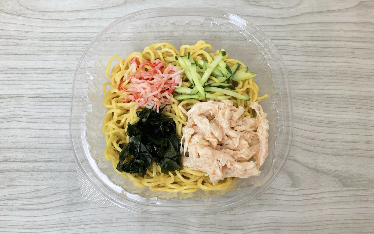 パッケージは、具材と麺が分けて入れられているセパレートタイプでした。具材は蒸し鶏・きゅうり・わかめ・カニかまの定番の4種類。色とりどりの具材をトッピングするのも冷やし中華の醍醐味です。
