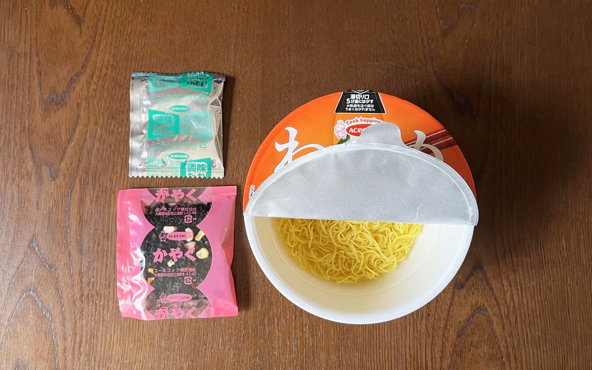 たれにはお酢が使われているため、後味はさっぱり。かやくに入っている鷹の爪も良いアクセントになって、どんどんと食べ進めたくなります。辛味は決して強くはなくあくまでじわじわと感じる程度なので、暑い時期にも食べやすいでしょう。麺とわかめに加え魚肉の練り物やコーンも入っていて、食感や彩りも良いですよ。
