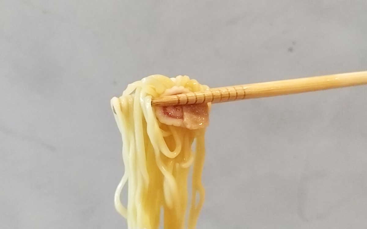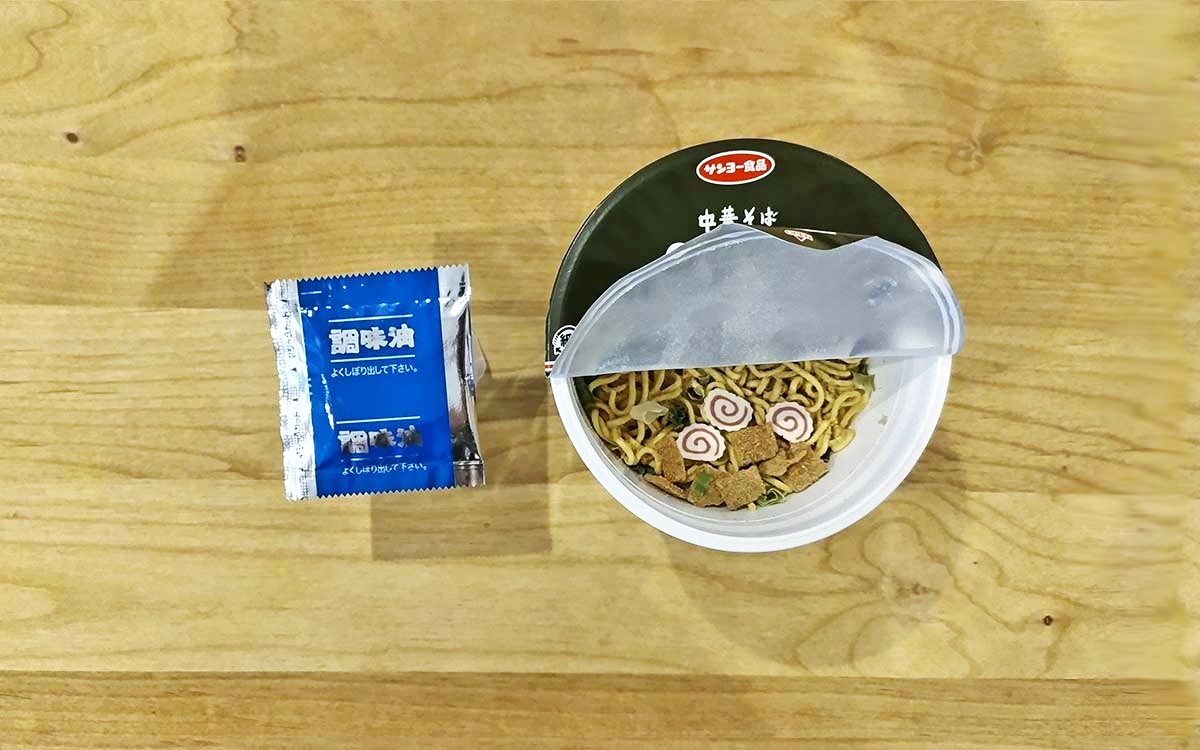 カップ麺に別添付されている小袋は、調味油の1つ。粉末スープや具材などはすでにカップに入っていました。お湯を注いだら、調味油をフタの上で温めます。3分待った後に調味油をINすると、さっそく魚介系の香りが漂ってきました。麺を一口いただいて驚いたのは、魚介と豚骨、そして醤油の風味です。濃厚な風味が味覚をビシビシと刺激してきました。