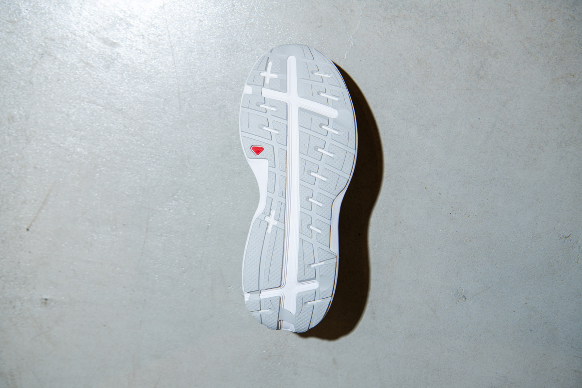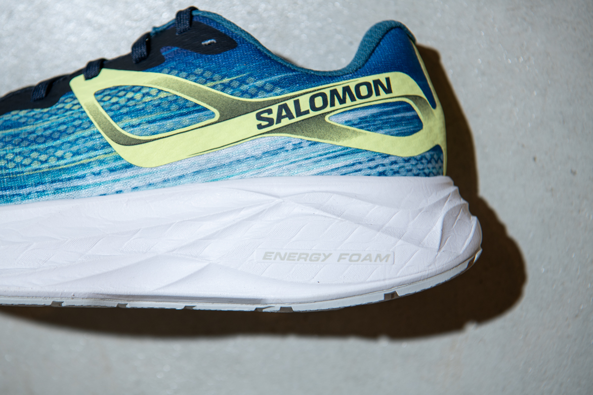 「エアロ グライドに使われる厚底のミッドソールは、サロモンが独自に開発した『エナジーフォーム』という素材です。エナジーフォームは、衝撃吸収性富んだEVAに、反発性を高めるオレフィンを配合しています。着地衝撃を推進力に換え、ガシガシと山を駆け巡るために開発された素材を、オンロード用にも使用しています」(山村さん)