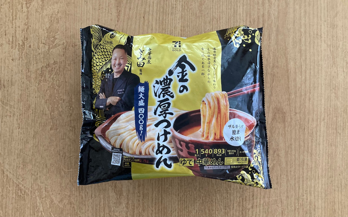 少し前から容器ごと温めるタイプの冷食ラーメンを販売するなど、日々進化を続けているセブン-イレブンの冷食。今回ご紹介する「金の濃厚つけめん」(516円/税込)は、「中華蕎麦 とみ田」の店主・富田治さんが監修した一品です。特徴はもちもちの極太麺と濃厚なカツオ出汁のスープ。さっそく準備して味わってみたいと思います。