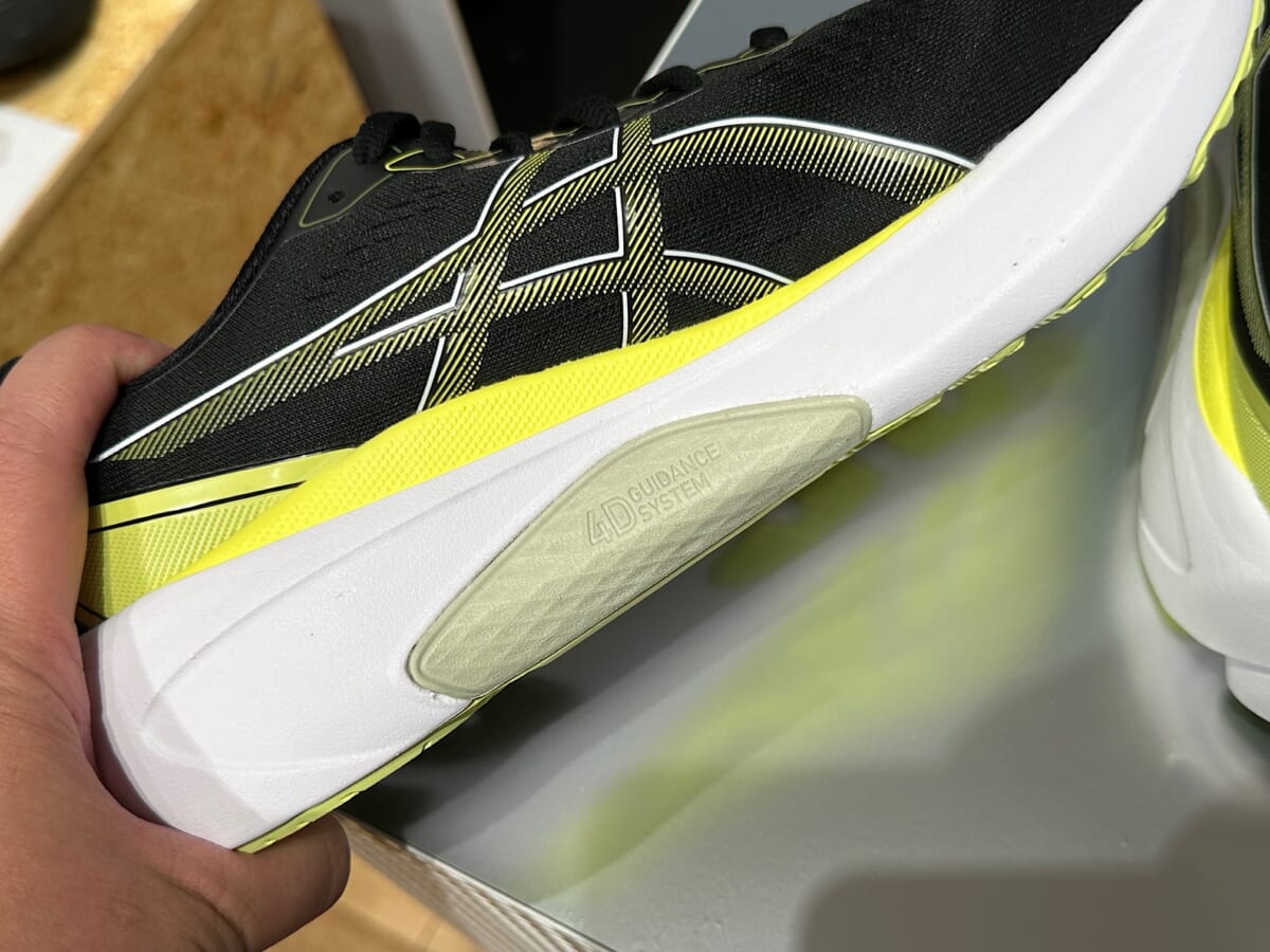 「4Dガイダンスシステム」とは、走行距離とともに変化するランナーの動きを研究し開発した複合的な機能構造で、①広がりを持たせたミッドソール、②アーチ部の高反発のフォーム材、③かかと部の適切な傾斜角度、④接地面積を広げたアウトソール。この4つの特徴を組み合わせることで、走行時の変化に適応した安定性と優れた快適性を実現しました。