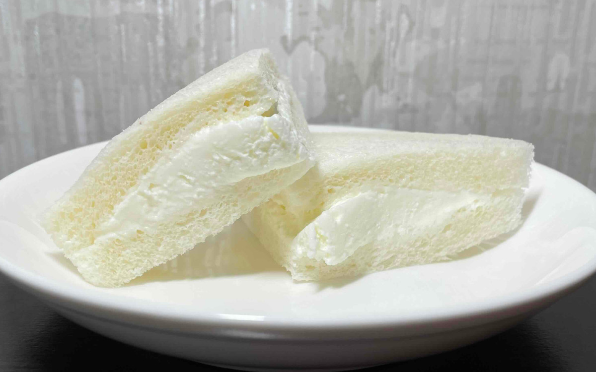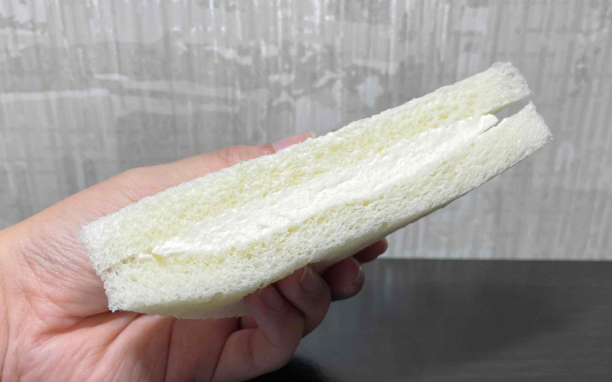 それではさっそく「たっぷり生クリームサンド」を実食していきましょう。パッケージから取り出したサンドは、想像以上に生クリームの重みをずっしりと感じました。少し力を加えると生クリームが溢れだしてしまいそうで、ふわふわのパンを潰してしまわないよう優しく持ち上げます。包丁で優しくカットしたものの、少しの衝撃で生クリームが今にも溢れそう。