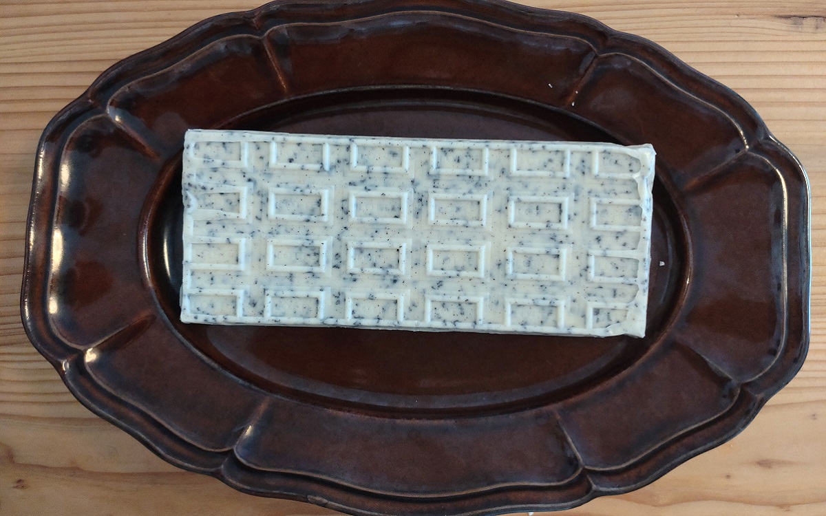 パッケージを開けた瞬間、濃厚なチーズの香りがふわり。チーズ嫌いの人だと思わず怯むのでは? と思うくらいチーズの香りがすごいですね。まずはお上品に、ひと欠片を割って口に運びます。香りの想像を裏切らないチーズ感! 口に入れて数秒は完全に口の中がチーズ1色です。
