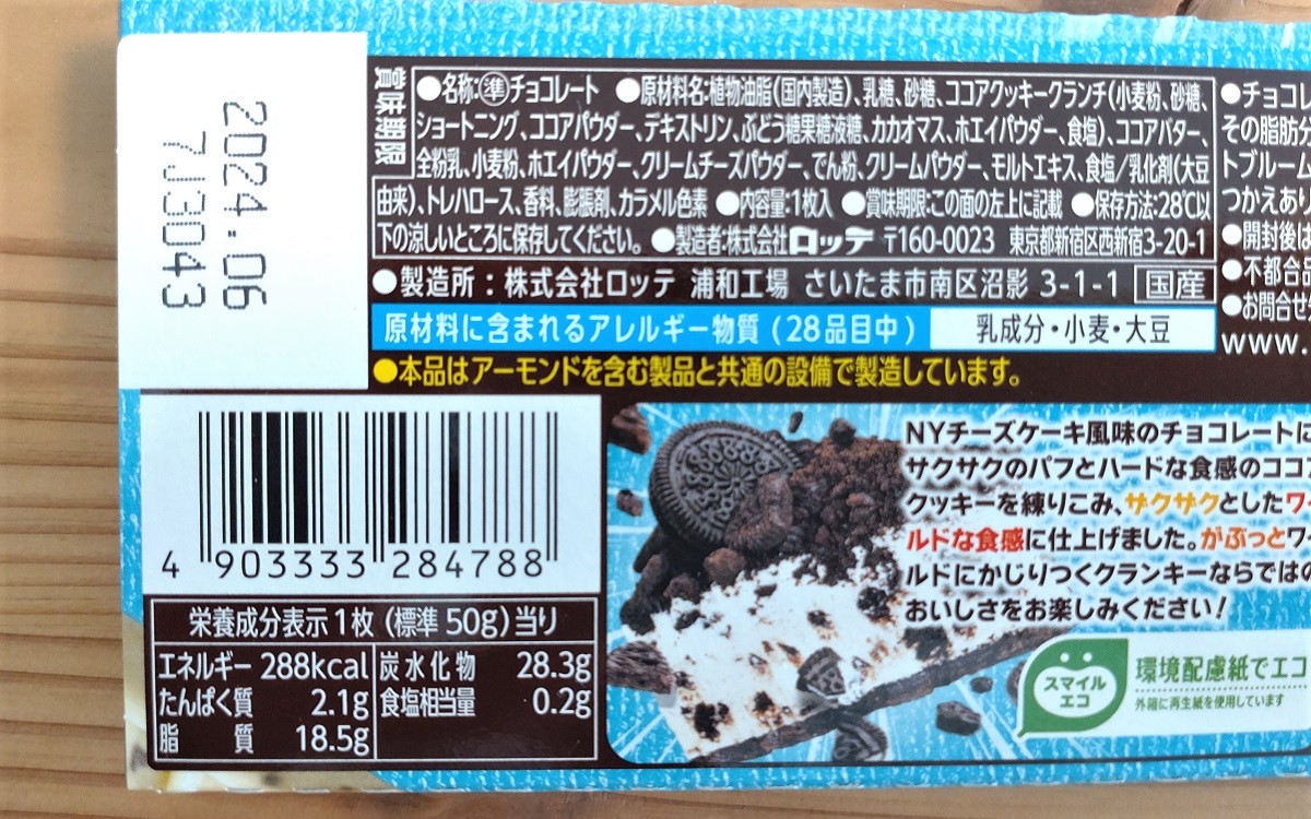 ベイクドにレア、バスクなどなど、チーズケーキにはさまざまな種類がありますが、今回ご紹介する「GET WILDクランキー<NYチーズケーキ>」(140円/税込)はニューヨークチーズケーキ味です。ニューヨークチーズケーキはベイクドチーズケーキの一種で、蒸すように「湯煎焼き」でじっくりと火を通すのが特徴。また一般的なベイクドチーズケーキと比べてクリームチーズの分量が多く、濃厚な味わいです。クッキーやクラッカーを砕いて“底”にしている点が、クランキーチョコと相性が良さそう!